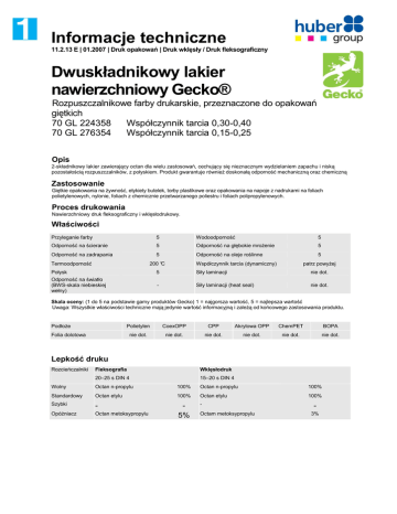 Informacje techniczne 11.2.13 E | 01.2007 | Druk opakowań | Druk wklęsły / Druk fleksograficzny Dwuskładnikowy lakier nawierzchniowy Gecko® Rozpuszczalnikowe farby drukarskie, przeznaczone do opakowań giętkich 70 GL 224358 Współczynnik tarcia 0,30-0,40 70 GL 276354 Współczynnik tarcia 0,15-0,25 Opis 2-składnikowy lakier zawierający octan dla wielu zastosowań, cechujący się nieznacznym wydzielaniem zapachu i niską pozostałością rozpuszczalników, z połyskiem. Produkt gwarantuje równieŜ doskonałą odporność mechaniczną oraz chemiczną Zastosowanie Giętkie opakowania na Ŝywność, etykiety butelek, torby plastikowe oraz opakowania na napoje z nadrukami na foliach polietylenowych, nylonie, foliach z chemicznie przetwarzanego poliestru i foliach polipropylenowych. Proces drukowania Nawierzchniowy druk fleksograficzny i wklęsłodrukowy. Właściwości Przyleganie farby 5 Wodoodporność 5 Odporność na ścieranie 5 Odporność na głębokie mroŜenie 5 5 Odporność na oleje roślinne Odporność na zadrapania Termoodporność 200 °C Połysk Odporność na światło (BWS-skala niebieskiej wełny) 5 Współczynnik tarcia (dynamiczny) patrz powyŜej 5 Siły laminacji nie dot. - Siły laminacji (heat seal) nie dot. Skala oceny: (1 do 5 na podstawie gamy produktów Gecko) 1 = najgorsza wartość, 5 = najlepsza wartość Uwaga: Wszystkie właściwości techniczne mają jedynie wartość informacyjną i zaleŜą od końcowego zastosowania produktu. PodłoŜe Polietylen CoexOPP CPP Akrylowa OPP ChemPET BOPA nie dot. nie dot. nie dot. nie dot. nie dot. nie dot. Folia dolotowa Lepkość druku Rozcieńczalniki Fleksografia Wklęsłodruk 20–25 s DIN 4 15–20 s DIN 4 Wolny Octan n-propylu 100% Octan n-propylu 100% Standardowy Octan etylu 100% Octan etylu 100% Szybki - - Opóźniacz Octan metoksypropylu 5% Octam metoksypropylu 3% Uwagi Rozcieńczalniki Rozpuszczalniki oraz urządzenia nie mogą zawierać wody ani alkoholu, które utrudniałyby reakcję utwardzania 2 składników. Drukowanie Ten lakier moŜe być stosowany jedynie do druku fleksograficznego, gdy stosowane są gumowe lub odporne na octan etylu fotopolimerowe matryce drukarskie. Środek Produkt ten moŜe być stosowany jedynie w połączeniu ze środkiem sieciującym 70GH132871, w proporcji sieciujący 100 części lakieru : 25 części środka sieciującego. Zadrukowany lakier twardnieje w pełni po 4 dniach (temp. > 10°C). Mieszanie Produkt ten naleŜy wstępnie wymieszać ze środkiem sieciującym przed rozcieńczeniem. Po przygotowaniu ten dwuskładnikowy lakier moŜe być stosowany nawet przez 24 godziny. Zdrowie i bezpieczeństwo Karty charakterystyki materiału niebezpiecznego zawierają wszystkie informacje przydatne przy tworzeniu odpowiednich instrukcji wewnątrzzakładowych. UŜytkownik jest odpowiedzialny za przestrzeganie przepisów lokalnych. Informacji dotyczących zastosowań na opakowaniach spoŜywczych szukaj w sekcji „Deklaracja zgodności". UŜywanie farby Informacje na temat obchodzenia się z farbą przeznaczoną do opakowań giętkich znajdują się w sekcji Ogólne wytyczne. Porady oraz więcej informacji znaleźć moŜna pod adresami podanymi na stronie www.hubergroup.de. Niniejsza karta informacji technicznej odzwierciedla obecny stan naszej wiedzy. Jest ona źródłem informacji i porad. Nie ponosimy odpowiedzialności za zawarte w niej błędy. Karta moŜe być modyfikowana wraz z wprowadzaniem technicznych ulepszeń. Informacja techniczna hubergroup · 11.2.13 E · Strona 1/1