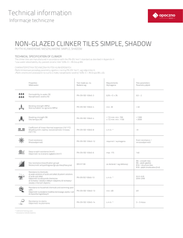 Technical information Informacje techniczne NON-GLAZED CLINKER TILES SIMPLE, SHADOW PŁYTKI KLINKIEROWE nieszkliwione Simple, Shadow Technical specification of clinker The clinker tiles are manufactured in accordance with the PN-EN 14411 standard as desribed in Appendix H “Low water absorbability dry-passed ceramic tiles” 0,5%< E < 3% Group BIb CHARAKTERYSTYKA TECHNICZNA PŁYTEK KLINKIEROWYCH Płytki klinkierowe posiadają parametry zgodne z normą PN-EN 14411, wg załącznika H, „Płytki ceramiczne prasowane na sucho o małej nasiąkliwości wodnej” 0,5%< E < 3% Grupa BIb, uGL Properties Właściwości Test made acc. to: Badanie wg: Requirements Wymagania Tiles parameters Parametry płytek Permeability to water (%) Nasiąkliwość wodna (%) PN-EN ISO 10545-3 0,5% < E ≤ 3% 0,5 – 2 Bending strength (MPa) Wytrzymałość na zginanie (MPa) PN-EN ISO 10545-4 min. 30 > 40 Breaking strength (N) Siła łamiąca (N) PN-EN ISO 10545-4 < 7,5 mm: min. 700 ≥ 7,5 mm: min. 1100 > 1300 > 2600 Coefficient of linear thermal expansion (10 -6/ 0C) Współczynnik cieplnej rozszerzalności liniowej (10 -6/ 0C) PN-EN ISO 10545-8 s.m.b. * <9 Frost resistance Mrozoodporność PN-EN ISO 10545-12 required / wymagana frost resistance / mrozoodporność Deep scratch resistance (mm3) Odporność na ścieranie wgłębne (mm3) PN-EN ISO 10545-6 max. 175 140 Slip resistance (classification group) Skuteczność antypoślizgowa (grupa klasyfikacyjna) DIN 51130 as declared / wg deklaracji R9 – smooth tiles R9 – płytki gładkie R10 – structure tiles R10 – płytki strukturalne (3-d) Resistance to chemicals: a) weak solutions of acids and alkali, b) potent solutions of acids and alkali Odporność na odczynniki chemiczne: a) na kwasy i zasady o słabym natężeniu, b) na kwasy i zasady o mocnym stężeniu PN-EN ISO 10545-13 s.m.b. * ULA-ULB UHA-UHB Resistance to household chemicals and swimming-pool salts Odporność na działanie środków domowego użytku i soli do basenów kąpielowych PN-EN ISO 10545-13 min. UB UA Resistance to stains Odporność na plamienie PN-EN ISO 10545-14 s.m.b. * 3 – 5 klasa * method of testing used * stosowana metoda badania
