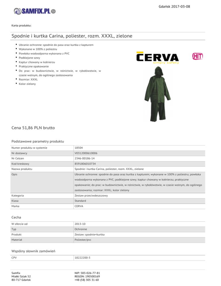 Gdańsk 2017-03-08 Karta produktu: Spodnie i kurtka Carina, poliester, rozm. XXXL, zielone Ubranie ochronne: spodnie do pasa oraz kurtka z kapturem Wykonane w 100% z poliestru Powłoka wodoodporna wykonana z PVC Podklejone szwy Kaptur chowany w kołnierzu Praktyczne opakowanie Do prac: w budownictwie, w rolnictwie, w rybołówstwie, w czasie wolnym, do ogólnego zastosowania Rozmiar: XXXL Kolor zielony Cena 51,86 PLN brutto Podstawowe parametry produktu Numer produktu w systemie 18504 Nr dostawcy V0312000610006 Nr Celcen 2346-00186-14 Kod kreskowy 8591806010734 Nazwa produktu Spodnie i kurtka Carina, poliester, rozm. XXXL, zielone Opis Ubranie ochronne: spodnie do pasa oraz kurtka z kapturem; wykonane w 100% z poliestru; powłoka wodoodporna wykonana z PVC; podklejone szwy; kaptur chowany w kołnierzu; praktyczne opakowanie; do prac: w budownictwie, w rolnictwie, w rybołówstwie, w czasie wolnym, do ogólnego zastosowania; rozmiar: XXXL; kolor zielony Kategoria Zestaw przeciwdeszczowy Klasa Standard Marka CERVA Cecha W ofercie od 2013-10 Typ Ochronne Produkt Zestaw: spodnie+kurtka Materiał Poliester/pvc Wspólny słownik zamówień CPV 18222200-3 Samfix Miałki Szlak 52 80-717 Gdańsk NIP: 583-026-77-81 REGON: 190500169 +48 (58) 305 31 60 Gdańsk 2017-03-08 Karta katalogowa produktu cd. Spodnie i kurtka Carina, poliester, rozm. XXXL, zielone Wymiary Rozmiar XXXL Certyfikaty Hit Hit Nowy produkt w ofercie Standard Kolor Kolor Zielony Serdecznie zapraszamy do współpracy Zespół Samfix. Samfix Miałki Szlak 52 80-717 Gdańsk NIP: 583-026-77-81 REGON: 190500169 +48 (58) 305 31 60