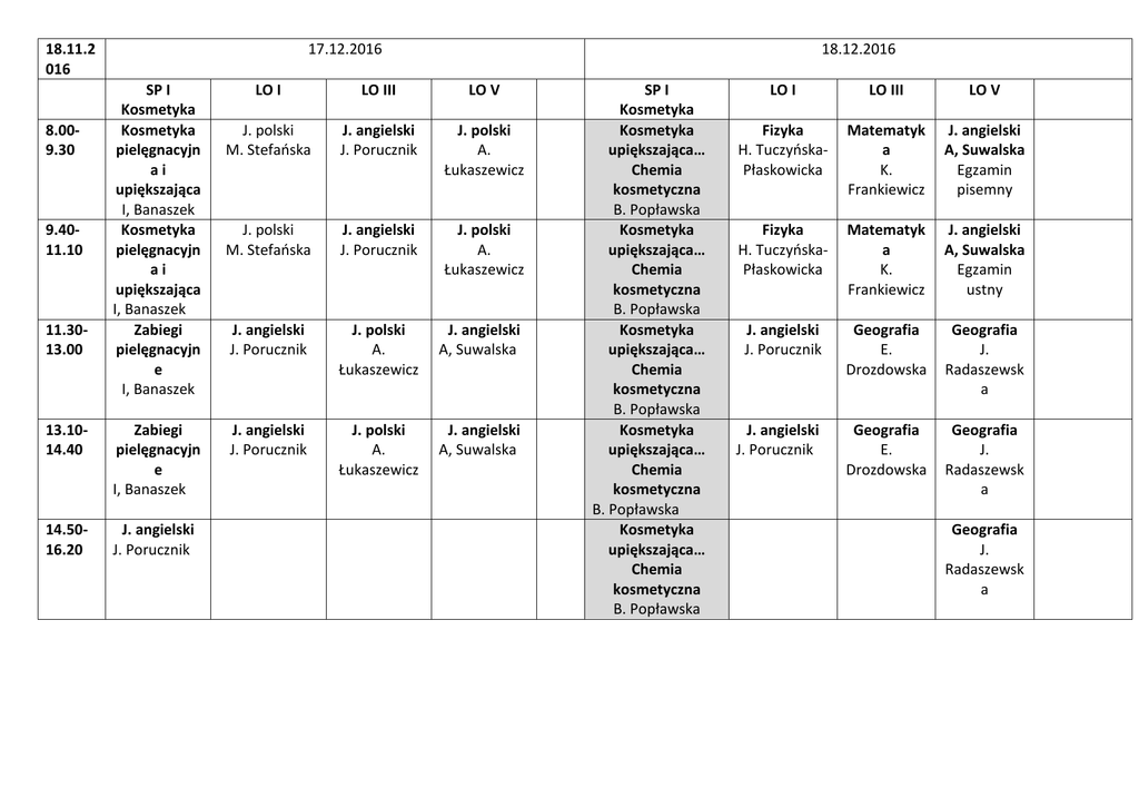 18.11.2 016 17.12.2016 18.12.2016 SP I Kosmetyka LO I LO III LO V