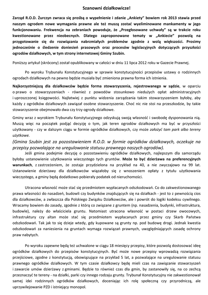 Szanowni działkowicze! Zarząd R.O.D. Żurczyn zwraca się prośbą o wypełnienie i zdanie „Ankiety” bowiem rok 2013 stawia przed naszym ogrodem nowe wymagania prawne ale też muszą zostać wyeliminowane mankamenty w jego funkcjonowaniu. Frekwencja na zebraniach powoduje, że „Przegłosowane uchwały” są w trakcie roku kwestionowane przez nieobecnych. Dlatego zaproponowane tematy w „Ankiecie” pozwolą na przygotowanie się do rozwiązania nabrzmiałych problemów zgodnie z wolą większości. Prosimy jednocześnie o śledzenie doniesień prasowych oraz procesów legislacyjnych dotyczących przyszłości ogrodów działkowych, w tym strony internetowej Gminy Szubin. Poniższy artykuł (skrócony) został opublikowany w całości w dniu 11 lipca 2012 roku w Gazecie Prawnej. Po wyroku Trybunału Konstytucyjnego w sprawie konstytucyjności przepisów ustawy o rodzinnych ogrodach działkowych na pewno będzie musiała być zmieniona prawna forma ich istnienia. Najkorzystniejszą dla działkowców będzie forma stowarzyszenia, rejestrowanego w sądzie, w oparciu o prawo o stowarzyszeniach - również z powodów stosunkowo niedużych opłat administracyjnych i uproszczonej księgowości. Najłatwiej z punktu widzenia zarządzania takim stowarzyszeniem byłoby, aby każdy z ogródków działkowych zawiązał osobne stowarzyszenie. Choć nic nie stoi na przeszkodzie, by takie stowarzyszenie obejmowało dwa czy trzy ogrody działkowe. Gminy wraz z wyrokiem Trybunału Konstytucyjnego odzyskują swoją własność i swobodę dysponowania nią. Muszą więc na początek podjąć decyzję o tym, jak teren ogrodów działkowych ma być w przyszłości użytkowany - czy w dalszym ciągu w formie ogródków działkowych, czy może założyć tam park albo tereny użytkowe. (Gmina Szubin jest za pozostawieniem R.O.D. w formie ogródków działkowych, oczekuje na przepisy pozwalające na uregulowanie statusu prawnego naszych ogrodów). Jeśli gmina podejmie decyzję o pozostawieniu ogródków działkowych, najlepszym dla samorządu byłoby ustanowienie użytkowania wieczystego tych gruntów. Może to być dzierżawa na preferencyjnych warunkach, z zastrzeżeniem, że zostaje przydzielona na przykład na 40, a nie zwyczajowo na 99 lat. Ustanowienie dzierżawy dla działkowców wiązałoby się z wnoszeniem opłaty z tytułu użytkowania wieczystego, a gminy będą dodatkowo pobierały podatek od nieruchomości. Utracona własność może stać się przedmiotem wypłacanych odszkodowań. Co do zakwestionowanego prawa własności do nasadzeń, budowli czy budynków znajdujących się na działkach - jest to z pewnością cios dla działkowców, a zwłaszcza dla Polskiego Związku Działkowców, ale i powrót do logiki kodeksu cywilnego. Wracamy bowiem do zasady, zgodnie z którą co związane z gruntem (np. nasadzenia, budynki, infrastruktura, budowle), należy do właściciela gruntu. Natomiast utracona własność w postaci drzew owocowych, infrastruktury czy altan może stać się przedmiotem wypłacanych przez gminy czy Skarb Państwa odszkodowań. Tak jak to się dzieje wtedy, gdy kupowane są grunty np. pod budowę drogi. Jednak kwestia odszkodowań za naniesienia na gruntach wymaga rozwiązań prawnych, uwzględniających zasadę ochrony praw nabytych. Po wyroku zapewne będą też uchwalone w ciągu 18 miesięcy przepisy, które pozwolą dostosować ideę ogródków działkowych do przepisów konstytucyjnych. Być może nowe przepisy wprowadzą rozwiązania przejściowe, zgodne z konstytucją, obowiązujące na przykład 5 lat, a pozwalające na uregulowanie statusu prawnego ogródków działkowych. W tym czasie działkowcy będę mieli czas na zawiązanie stowarzyszeń i zawarcie umów dzierżawy z gminami. Będzie to również czas dla gmin, by zastanowiły się, na co zechcą przeznaczyć te tereny - na działki, parki czy innego rodzaju grunty. Trybunał Konstytucyjny nie zakwestionował samej idei rodzinnych ogródków działkowych, doceniając ich rolę społeczną czy przyrodniczą, ale uprzywilejowanie PZD i istniejący monopol.