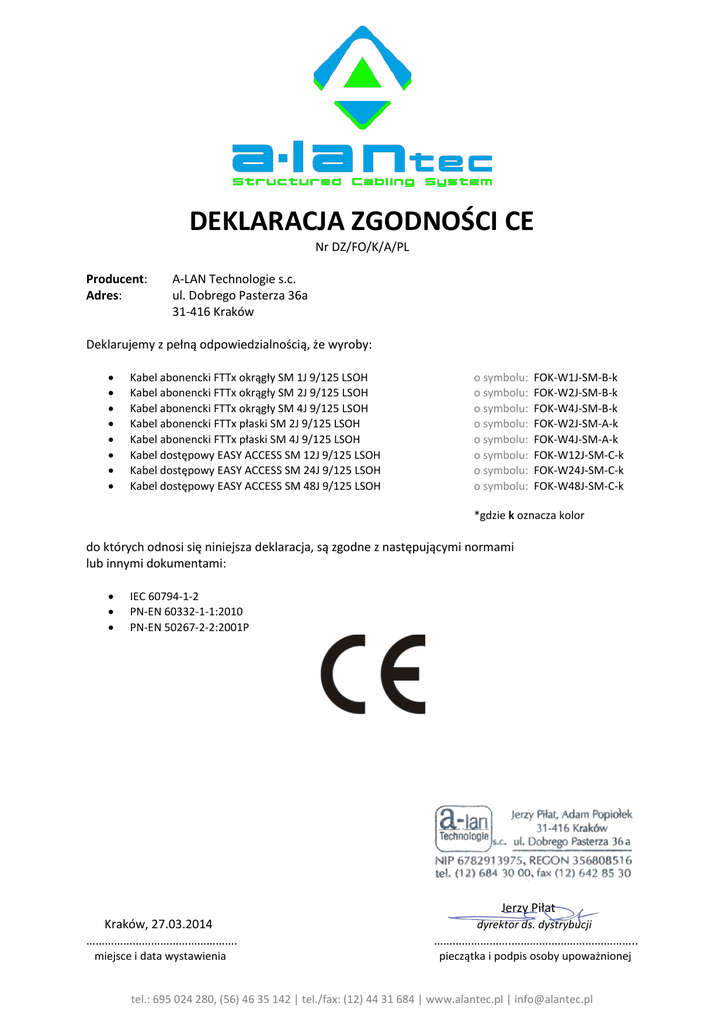 DEKLARACJA ZGODNOŚCI CE Nr DZ/FO/K/A/PL Producent: Adres: A-LAN Technologie s.c. ul. Dobrego Pasterza 36a 31-416 Kraków Deklarujemy z pełną odpowiedzialnością, że wyroby: Kabel abonencki FTTx okrągły SM 1J 9/125 LSOH Kabel abonencki FTTx okrągły SM 2J 9/125 LSOH Kabel abonencki FTTx okrągły SM 4J 9/125 LSOH Kabel abonencki FTTx płaski SM 2J 9/125 LSOH Kabel abonencki FTTx płaski SM 4J 9/125 LSOH Kabel dostępowy EASY ACCESS SM 12J 9/125 LSOH Kabel dostępowy EASY ACCESS SM 24J 9/125 LSOH Kabel dostępowy EASY ACCESS SM 48J 9/125 LSOH o symbolu: o symbolu: o symbolu: o symbolu: o symbolu: o symbolu: o symbolu: o symbolu: FOK-W1J-SM-B-k FOK-W2J-SM-B-k FOK-W4J-SM-B-k FOK-W2J-SM-A-k FOK-W4J-SM-A-k FOK-W12J-SM-C-k FOK-W24J-SM-C-k FOK-W48J-SM-C-k *gdzie k oznacza kolor do których odnosi się niniejsza deklaracja, są zgodne z następującymi normami lub innymi dokumentami: IEC 60794-1-2 PN-EN 60332-1-1:2010 PN-EN 50267-2-2:2001P Jerzy Piłat Kraków, 27.03.2014 …………………………………………. …………………….………………………………….. miejsce i data wystawienia pieczątka i podpis osoby upoważnionej dyrektor ds. dystrybucji tel.: 695 024 280, (56) 46 35 142 | tel./fax: (12) 44 31 684 | www.alantec.pl | [email protected]