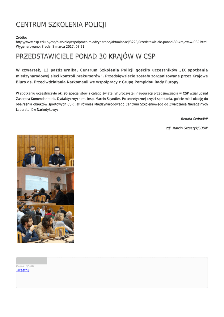 CENTRUM SZKOLENIA POLICJI Źródło: http://www.csp.edu.pl/csp/o-szkole/wspolpraca-miedzynarodo/aktualnosci/3228,Przedstawiciele-ponad-30-krajow-w-CSP.html Wygenerowano: Środa, 8 marca 2017, 08:21 PRZEDSTAWICIELE PONAD 30 KRAJÓW W CSP W czwartek, 13 października, Centrum Szkolenia Policji gościło uczestników „IX spotkania międzynarodowej sieci kontroli prekursorów”. Przedsięwzięcie zostało zorganizowane przez Krajowe Biuro ds. Przeciwdziałania Narkomanii we współpracy z Grupą Pompidou Rady Europy. W spotkaniu uczestniczyło ok. 90 specjalistów z całego świata. W uroczystej inauguracji przedsięwzięcia w CSP wziął udział Zastępca Komendanta ds. Dydaktycznych mł. insp. Marcin Szyndler. Po teoretycznej części spotkania, goście mieli okazję do obejrzenia obiektów sportowych CSP, jak również Międzynarodowego Centrum Szkoleniowego do Zwalczania Nielegalnych Laboratoriów Narkotykowych. Renata Cedro/WP zdj. Marcin Grzeszyk/SDDiP Ocena: 0/5 (0) Tweetnij
