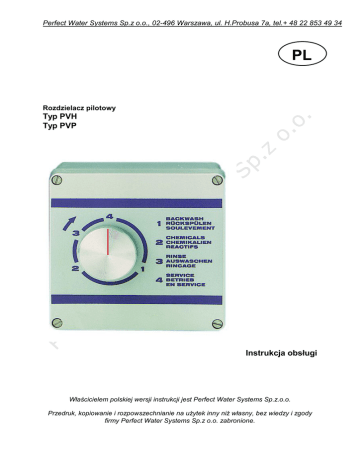 Perfect Water Systems Sp.z o.o., 02-496 Warszawa, ul. H.Probusa 7a, tel.+ 48 22 853 49 34 PL Rozdzielacz pilotowy Typ PVH Typ PVP Instrukcja obsługi Właścicielem polskiej wersji instrukcji jest Perfect Water Systems Sp.z.o.o. Przedruk, kopiowanie i rozpowszechnianie na użytek inny niż własny, bez wiedzy i zgody firmy Perfect Water Systems Sp.z o.o. zabronione. 2 Perfect Water Systems Sp.z o.o., 02-496 Warszawa, ul. H.Probusa 7a, tel.+ 48 22 853 49 34 Rozdzielacz pilotowy jest to zawór sterujący sprzęgnięty z silnikiem nastawczym. Jest on stosowany w automatycznie pracujących instalacjach uzdatniania wody z indywidualnymi zaworami. Za pomocą silnika nastawczego możliwe jest w ciągu 1 obrotu nastawienie 4 różnych położeń sterowniczych zaworu sterującego (płukanie wsteczne, regenerowanie, wymywanie i praca). Rozdzielacz pilotowy jest zasterowywany przez sygnały elektryczne z programatora (układ sterowania w zależności od ilości, od jakości wzgl. od czasu). Zasterowanie poszczególnych zaworów membranowych w instalacji uzdatniania wody jest możliwe przez przełącznik przemienny lub impulsowy (żądane wykonanie należy podać w zamówieniu). Przy uruchamianiu tarczę sterującą rozdzielacza pilotowego można obrócić ręcznie w żądane położenie sterownicze. Montaż i uruchomienie Montaż i uruchomienie powinny być wykonywane przez wykwalifikowanych pracowników. Urządzenie musi być zainstalowane zgodnie z parametrami podanymi w danych technicznych (np. temperatura otoczenia) i obsługiwane w sposób zgodny z odpowiednimi normami (DIN, VDE, BHP), lub zgodnie z przepisami ustanowionymi przez poszczególne państwa. Chronić przed nadmierną wilgotnością, oraz zmoknięciem. Obsługiwać kontroler zgodnie z zaleceniami producenta i zgodnie z przeznaczeniem. Dane techniczne: Dane techniczne Przyłącze sieciowe: 230 V/50-60 Hz lub Położ. PVH-PVP Położ. filtra Otwarte zawory 4 Praca 1+2 24V/50-60 Hz - - 2+3 Pobór mocy: ok. 5 VA 1 Płukanie wsteczne 3+4 Rodzaj ochrony: IP 44 - - 4+5 Wymiary: wys. x szer. x gł. = 125 x 120 x 220 mm 2 Regeneracja 5+6 Masa: 1,6 kg 3 Wymywanie 6+1 Przyłącza zaworowe są przewidziane dla podłączenia węża z twardego nylonu o średnicy wewnętrznej 4 mm i średnicy zewnętrznej 6 mm 3 Perfect Water Systems Sp.z o.o., 02-496 Warszawa, ul. H.Probusa 7a, tel.+ 48 22 853 49 34 Przełącznik przemienny Rozdzielacz pilotowy z 4 położeniami sterowniczymi, wykonanie: przełącznik przemienny, zaprojektowany dla 10 atn. ciśnienia hydraulicznego wzgl. 4,5 atn ciśnienia pneumatycznego, bez złączek, do uruchamiania: Nr zamów. 220 V/50 Hz Nr zamów. 24 V/50 Hz PVH zaworów otwartych bez ciśnienia 250001 250002 PVH 4 zaworów zamkniętych bez ciśnienia 250003 250004 Rozdzielacz pilotowy z 4 położeniami sterowniczymi, wykonanie: przełącznik przemienny zaprojektowany na 10 atn. ciśnienia pneumatycznego, bez złączek, do uruchamiania: PVP zaworów otwartych bez ciśnienia 250010 250011 PVP 4 zaworów zamkniętych bez ciśnienia 250012 250013 Nr zamów. 220 V/50 Hz Nr zamów. 24 V/50 Hz Łącznik impulsowy Rozdzielacz pilotowy z 4 położeniami sterowniczymi, wykonanie: łącznik impulsowy, zaprojektowany dla 10 atn ciśnienia hydraulicznego wzgl. 4,5 atn ciśnienia pneumatycznego, bez złączek, do uruchamiania: PVH I zaworów otwartych bez ciśnienia 2500015 250006 PVH I 4 zaworów zamkniętych bez ciśnienia 250007 250008 Rozdzielacz pilotowy z 4 położeniami sterowniczymi, wykonanie: łącznik impulsowy, zaprojektowany na 10 atn ciśnienia pneumatycznego, bez złączek, do uruchamiania: PVP I zaworów otwartych bez ciśnienia 250014 250015 PVP I 4 zaworów zamkniętych bez ciśnienia 250016 250017 1 komplet złączek dla rozdzielacza pilotowego 250020 Rozdzielacz pilotowy w wykonaniu specjalnym Typ S1 Nr zamów. Rozdzielacz pilotowy z tarczą dodatkową i zestykami obojętnymi do sterowania zaworu wzgl. stycznika podczas przebiegu programu 25 00 31 S2 Rozdzielacz pilotowy jak S1, jednak z dwiema tarczami dodatkowymi 25 00 32 S3 Rozdzielacz pilotowy z możliwością podłączenia dla zdalnego wskaźnika przebiegu programu 25 00 33 S4 Rozdzielacz pilotowy z automatycznym cofaniem (na pracę) przez włączony w układ programator 25 00 34 S5 Rozdzielacz pilotowy będący połączeniem typu S1 i S3 25 00 35 S6 Rozdzielacz pilotowy będący połączeniem typu S1 i S4 25 00 36 S7 Rozdzielacz pilotowy będący połączeniem typu S3 i S4 25 00 37 S8 Rozdzielacz pilotowy z automatycznym cofaniem przez włączony w układ programator 25 00 38 Wszystkie tarcze z wtykami, 1 wtyk = 5 minut 25 00 39 S9 Przy zamawianiu należy podać nr zamów. rozdzielacza pilotowego oraz nr zamów. wykonania specjalnego. 4 Perfect Water Systems Sp.z o.o., 02-496 Warszawa, ul. H.Probusa 7a, tel.+ 48 22 853 49 34 Wykaz części i aksesorów zamiennych: Przykład instalacji do zmiękczania z rozdzielaczem pilotowym 5 Perfect Water Systems Sp.z o.o., 02-496 Warszawa, ul. H.Probusa 7a, tel.+ 48 22 853 49 34 Schemat instalacji elektrycznej: Perfect Water Systems Sp.z o.o., 02-496 Warszawa, ul. H.Probusa 7a, tel.+ 48 22 853 49 34 Właścicielem polskiej wersji instrukcji jest Perfect Water Systems Sp.z.o.o. Przedruk, kopiowanie i rozpowszechnianie na użytek inny niż własny, bez wiedzy i zgody firmy Perfect Water Systems Sp.z o.o. zabronione.