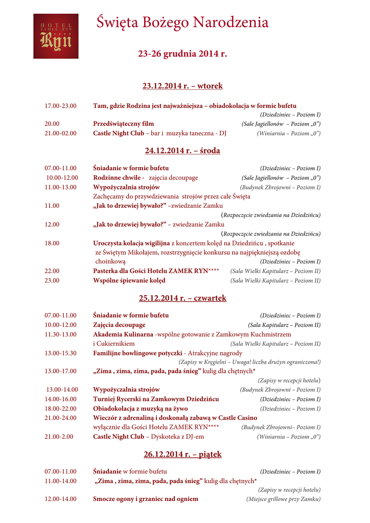 Święta Bożego Narodzenia 23-26 grudnia 2014 r. 23.12.2014 r. – wtorek 17.00-23.00 20.00 21.00-02.00 Tam, gdzie Rodzina jest najważniejsza – obiadokolacja w formie bufetu Przedświąteczny film Castle Night Club – bar i muzyka taneczna - DJ (Dziedziniec – Poziom I) (Sale Jagiellonów – Poziom „0”) (Winiarnia – Poziom „0”) 24.12.2014 r. – środa 07.00-11.00 10.00-12.00 11.00-13.00 11.00 12.00 18.00 22.00 23.00 Śniadanie w formie bufetu (Dziedziniec – Poziom I) Rodzinne chwile - zajęcia decoupage (Sale Jagiellonów – Poziom „0”) (Budynek Zbrojowni – Poziom I) Wypożyczalnia strojów Zachęcamy do przywdziewania strojów przez całe Święta „Jak to drzewiej bywało?” –zwiedzanie Zamku (Rozpoczęcie zwiedzania na Dziedzińcu) „Jak to drzewiej bywało?” – zwiedzanie Zamku (Rozpoczęcie zwiedzania na Dziedzińcu) Uroczysta kolacja wigilijna z koncertem kolęd na Dziedzińcu , spotkanie ze Świętym Mikołajem, rozstrzygnięcie konkursu na najpiękniejszą ozdobę choinkową (Dziedziniec – Poziom I) Pasterka dla Gości Hotelu ZAMEK RYN**** (Sala Wielki Kapitularz – Poziom II) (Sala Wielki Kapitularz – Poziom II) Wspólne śpiewanie kolęd 25.12.2014 r. – czwartek 07.00-11.00 10.00-12.00 11.30-13.00 13.00-15.30 Śniadanie w formie bufetu (Dziedziniec – Poziom I) Zajęcia decoupage (Sala Kapitularz – Poziom II) Akademia Kulinarna -wspólne gotowanie z Zamkowym Kuchmistrzem i Cukiernikiem (Sala Wielki Kapitularz – Poziom II) Familijne bowlingowe potyczki - Atrakcyjne nagrody (Zapisy w Kręgielni – Uwaga! liczba drużyn ograniczona!) 13.00-17.00 „Zima , zima, zima, pada, pada śnieg” kulig dla chętnych* (Zapisy w recepcji hotelu) 13.00-14.00 14.00-16.00 18.00-22.00 21.00-24.00 21.00-2.00 (Budynek Zbrojowni – Poziom I) Wypożyczalnia strojów Turniej Rycerski na Zamkowym Dziedzińcu (Dziedziniec – Poziom I) Obiadokolacja z muzyką na żywo (Dziedziniec – Poziom I) Wieczór z adrenaliną i doskonałą zabawą w Castle Casino wyłącznie dla Gości Hotelu ZAMEK RYN**** (Budynek Zbrojowni– Poziom I) Castle Night Club – Dyskoteka z DJ-em (Winiarnia – Poziom „0”) 26.12.2014 r. – piątek 07.00-11.00 11.00-14.00 Śniadanie w formie bufetu (Dziedziniec – Poziom I) „Zima , zima, zima, pada, pada śnieg” kulig dla chętnych* 12.00-14.00 Smocze ogony i grzaniec nad ogniem (Zapisy w recepcji hotelu) (Miejsce grillowe przy Zamku) Tego dnia, po wcześniejszym zgłoszeniu w recepcji hotelu, możliwe jest bezpłatne przedłużenie doby hotelowej do godz. 16.00 w miarę dostępności miejsc. * W cenie 30zł/Osoba Wesołych Świąt ! Usługi dodatkowe – bezpłatne • Bajkogród (Klub Malucha) - działa przez całe Święta (do dyspozycji zabawki, farby, kredki, wycinanki, gry planszowe, gry Xbox). do Bajkogrodu zapraszamy Dzieci, które mają ukończone 4 lata, młodsze - tylko pod opieką Rodziców. • Hotel zapewnia dodatkową opiekę do dzieci w Klubie Malucha w dniach 23-26.12 (23.12 w godz. 15.00-20.00, 24.12 w godz. 10.00-13.00, 13.30-17.00, 25.12 w godz. 11.00-13.00, 14.00-19.00, 26.12 w godz. 10.00-12.00, 14.00-17.00) • Korzystanie z Sali Fitness i stołu do tenisa w Zbrojowni (codziennie w godzinach 7.00-23.00) • Korzystanie z basenu, jacuzzi i saun (codziennie w godzinach 8.00-22.00, 24.12.2014 r. – do godz. 18.00) • Obiadokolacje dla Gości, którzy przedłużyli swój pobyt, serwowane będą w restauracji Refektarz w godzinach 17.00-22.00 Usługi dodatkowe – płatne • SPA Księżnej Anny - zapraszamy do korzystania z naszych propozycji – gabinety czynne codziennie w godzinach 9.00-21.00, 24.12.2014 r. do godz. 17.00 rezerwacja tel. 862) • Zbrojownia – (czynna codziennie w godz. 12.00-23.00, w dniu 24.12.2014 r. do godz. 17.00, rezerwacja tel. 803) - kręgielnia 60 zł/1 godz., bilard (dwa stoły w Sali Myśliwskiej - żeton 5 zł) • Indywidualna opieka do dzieci w czasie pobytu świątecznego – zapisy przyjmuje recepcja basenu (rezerwacja tel. 805)