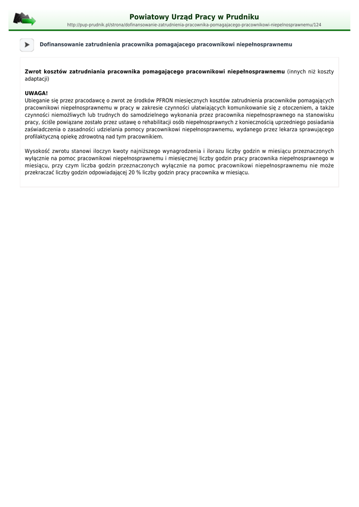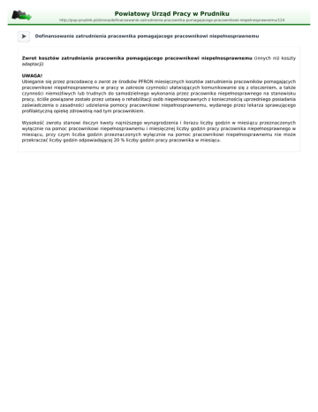 Powiatowy Urząd Pracy w Prudniku http://pup-prudnik.pl/strona/dofinansowanie-zatrudnienia-pracownika-pomagajacego-pracownikowi-niepelnosprawnemu/124 Dofinansowanie zatrudnienia pracownika pomagajacego pracownikowi niepełnosprawnemu Zwrot kosztów zatrudniania pracownika pomagającego pracownikowi niepełnosprawnemu (innych niż koszty adaptacji) UWAGA! Ubieganie się przez pracodawcę o zwrot ze środków PFRON miesięcznych kosztów zatrudnienia pracowników pomagających pracownikowi niepełnosprawnemu w pracy w zakresie czynności ułatwiających komunikowanie się z otoczeniem, a także czynności niemożliwych lub trudnych do samodzielnego wykonania przez pracownika niepełnosprawnego na stanowisku pracy, ściśle powiązane zostało przez ustawę o rehabilitacji osób niepełnosprawnych z koniecznością uprzedniego posiadania zaświadczenia o zasadności udzielania pomocy pracownikowi niepełnosprawnemu, wydanego przez lekarza sprawującego profilaktyczną opiekę zdrowotną nad tym pracownikiem. Wysokość zwrotu stanowi iloczyn kwoty najniższego wynagrodzenia i ilorazu liczby godzin w miesiącu przeznaczonych wyłącznie na pomoc pracownikowi niepełnosprawnemu i miesięcznej liczby godzin pracy pracownika niepełnosprawnego w miesiącu, przy czym liczba godzin przeznaczonych wyłącznie na pomoc pracownikowi niepełnosprawnemu nie może przekraczać liczby godzin odpowiadającej 20 % liczby godzin pracy pracownika w miesiącu.