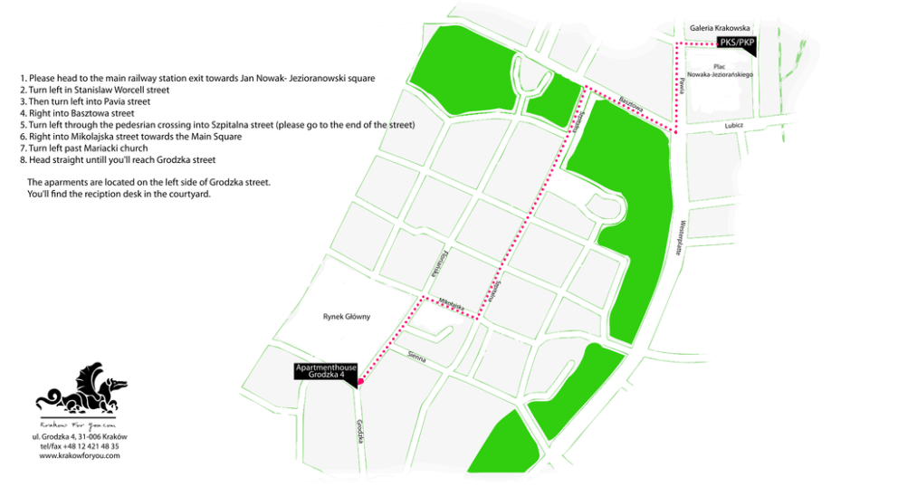 Galeria Krakowska PKS/PKP Bas Pawia 1. Please head to the main railway station exit towards Jan Nowak- Jezioranowski square 2. Turn left in Stanislaw Worcell street 3. Then turn left into Pavia street 4. Right into Basztowa street 5. Turn left through the pedesrian crossing into Szpitalna street (please go to the end of the street) 6. Right into Mikolajska street towards the Main Square 7. Turn left past Mariacki church 8. Head straight untill you'll reach Grodzka street Plac Nowaka-Jeziorańskiego Lubicz lna Szp ita zto wa The aparments are located on the left side of Grodzka street. You'll find the reciption desk in the courtyard. Westerp latte ńsk Flo ria a ołaj na ital Szp Mik Rynek Główny Sien Apartmenthouse Grodzka 4 Grodzka ul. Grodzka 4, 31-006 Kraków tel/fax +48 12 421 48 35 www.krakowforyou.com na ska