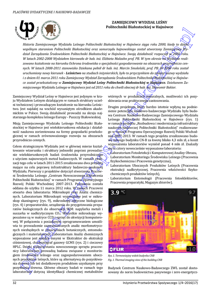 PLACÓWKI DYDAKTYCZNE I NAUKOWO-BADAWCZE .pl ZAMIEJSCOWY WYDZIAŁ LEŚNY Politechniki Białostockiej w Hajnówce .w m. tu. ko sza lin Historia Zamiejscowego Wydziału Leśnego Politechniki Białostockiej w Hajnówce sięga roku 2000, kiedy to dzięki wspólnym staraniom Politechniki Białostockiej oraz samorządu hajnowskiego został utworzony Zamiejscowy Wydział Zarządzania Środowiskiem Politechniki Białostockiej w Hajnówce. Swoją działalność rozpoczął w 2002 roku. W latach 2002-2008 Wydziałem kierowała dr hab. inż. Elżbieta Malzahn prof. PB. W tym okresie na Wydziale realizowano kształcenie na kierunku Ochrona środowiska o specjalności gospodarowanie na obszarach przyrodniczo cennych. W latach 2008-2011 stanowisko Dziekana pełnił dr hab. inż. Marcin Smoleński, prof. PB. W 2008 roku został uruchomiony nowy kierunek - Leśnictwo na studiach inżynierskich, było to przyczynkiem do zmiany nazwy wydziału i z dniem 01 marca 2011 roku Zamiejscowy Wydział Zarządzania Środowiskiem Politechniki Białostockiej w Hajnówce został przekształcony w Zamiejscowy Wydział Leśny Politechniki Białostockiej w Hajnówce. Dziekanem Zamiejscowego Wydziału Leśnego w Hajnówce jest od 2011 roku do chwili obecnej dr hab. inż. Sławomir Bakier. Zamiejscowy Wydział Leśny w Hajnówce jest jedynym w kraju Wydziałem Leśnym działającym w ramach struktury uczelni technicznej i prowadzącym kształcenie na kierunku Leśnictwo. Jest najdalej na wschód wysuniętym ośrodkiem akademickim w Polsce. Swoją działalność prowadzi na skraju najstarszego kompleksu leśnego Europy - Puszczy Białowieskiej. Misją Zamiejscowego Wydziału Leśnego Politechniki Białostockiej w Hajnówce jest wielokierunkowa edukacja i działalność naukowa zorientowana na formy gospodarki proekologicznej w ramach zrównoważonego rozwoju na obszarach przyrodniczo cennych. Drugim projektem, który bardzo istotnie wpłyną na podniesienie potencjału naukowo-badawczego Wydziału była budowa Centrum Naukowo-Badawczego Zamiejscowego Wydziału Leśnego Politechniki Białostockiej w Hajnówce (rys. 1) w ramach projektu „Rozbudowa i modernizacja infrastruktury naukowo-badawczej Politechniki Białostockiej” realizowanego w ramach Programu Operacyjnego Rozwój Polski Wschodniej 2007-2013. W ramach tego projektu zrealizowano budowę nowego budynku CN-B za kwotę blisko 4,3 mln zł, a koszt wyposażenia laboratoriów wyniósł ponad 4 mln zł. Znalazły się tu cztery nowocześnie wyposażone laboratoria: Laboratorium Fotodetekcji i Komputerowej Analizy Obrazu, Laboratorium Monitoringu Środowiska Leśnego (Pracownia fizykochemiczna i Pracownia genetyczna), Laboratorium Ubocznych Produktów Leśnych (Pracownia ekstrakcji nadkrytycznej, Pracownia właściwości fizykochemicznych produktów leśnych), Laboratorium Entomologii (Pracownia fotoeklektorów, Pracownia preparatyki, Magazyn zbiorów). po bra no z ww w. ips Celem strategicznym Wydziału jest w głównej mierze kształtowanie wizerunku i struktury jednostki poprzez prowadzenie wielokierunkowych badań środowiska przyrodniczego z użyciem najnowszych metod badawczych. W ramach realizacji tego celu w latach 2011-2015 zrealizowano dwa projekty mające na celu poprawę infrastruktury badawczo-naukowej Wydziału. Pierwszy z projektów dotyczył stworzenia Pracowni Środowiska Leśnego „Centrum Nowoczesnego Kształcenia Politechniki Białostockiej” w ramach Programu Operacyjnego Rozwój Polski Wschodniej 2007-2013. Pracownia została oddana do użytku 11 marca 2012 roku. W ramach Pracowni otwarto dwa laboratoria: Mikroskopii oraz Analiz chemicznych. Laboratorium Mikroskopii wyposażone jest w mikroskop skaningowy (rys. 9), mikroskopy optyczne biologiczne (rys. 4) i preparatorskie, urządzenia do przygotowania preparatów biologicznych do obserwacji SEM: napylarka metali i suszarka w nadkrytycznym CO2. Wszystkie mikroskopy wyposażone są w matryce CCD i sprzęt do akwizycji komputerowej. W połączeniu z posiadanym oprogramowaniem umożliwia to prowadzenie zaawansowanych analiz morfometrycznych niezbędnych w oznaczeniach botanicznych, entomologicznych i materiałowych. Laboratorium Analiz chemicznych wyposażone jest między innymi w Ekstraktor do ekstrakcji ciśnieniowej, chromatograf gazowy GCMS (rys. 2) i cieczowy HPLC. Dzięki wykorzystaniu nowoczesnego sprzętu pracownicy laboratorium prowadzą badana związane z monitoringiem środowiska leśnego oraz zagospodarowaniem ubocznych produktów leśnych, które są alternatywą do pozyskiwania drewna lub też dodatkowym produktem uzyskanym przy pozyskaniu drewna. Główne obszary badań w ramach tego laboratorium dotyczą identyfikacji chemicznej metabolitów wtórnych w produktach naturalnych, możliwości ich pozyskiwania oraz praktycznego zastosowania. 32 Rys. 1. Termowizyjny widok budynku CNB Fig. 1. Thermal imaging view of the building CNB Budynek Centrum Naukowo-Badawczego ZWL został dostosowany do norm budownictwa pasywnego i zero energetyczInżynieria Przetwórstwa Spożywczego 1/4–2016(17) PLACÓWKI DYDAKTYCZNE I NAUKOWO-BADAWCZE .pl Laboratorium Ubocznych Produktów Leśnych ukierunkowane jest na analizę właściwości fizykochemicznych: składu chemicznego, barwy, przemian fazowych, właściwości reologicznych (rys. 8) ubocznych produktów leśnych. Prowadzone są tu również innowacyjne badania nad pozyskaniem substancji aktywnych z ubocznych produktów leśnych przy wykorzystaniu frakcyjnej ekstrakcji nadkrytycznym ditlenkiem węgla (rys. 7), a także prace nad zagospodarowaniem odpadowych produktów (cetyna, karpina, kora) powstających przy pozyskaniu drewna. .w m. tu. ko sza Aktualne badania naukowe realizowane na ZWL skupiają się wokół zagadnień związanych z wykorzystaniem ubocznych produktów leśnych oraz badaniem środowiska leśnego Puszczy Białowieskiej. mikro i makroskopowych. Istotnym kierunkiem badawczym są również badania palinologiczne głównie drzew leśnych