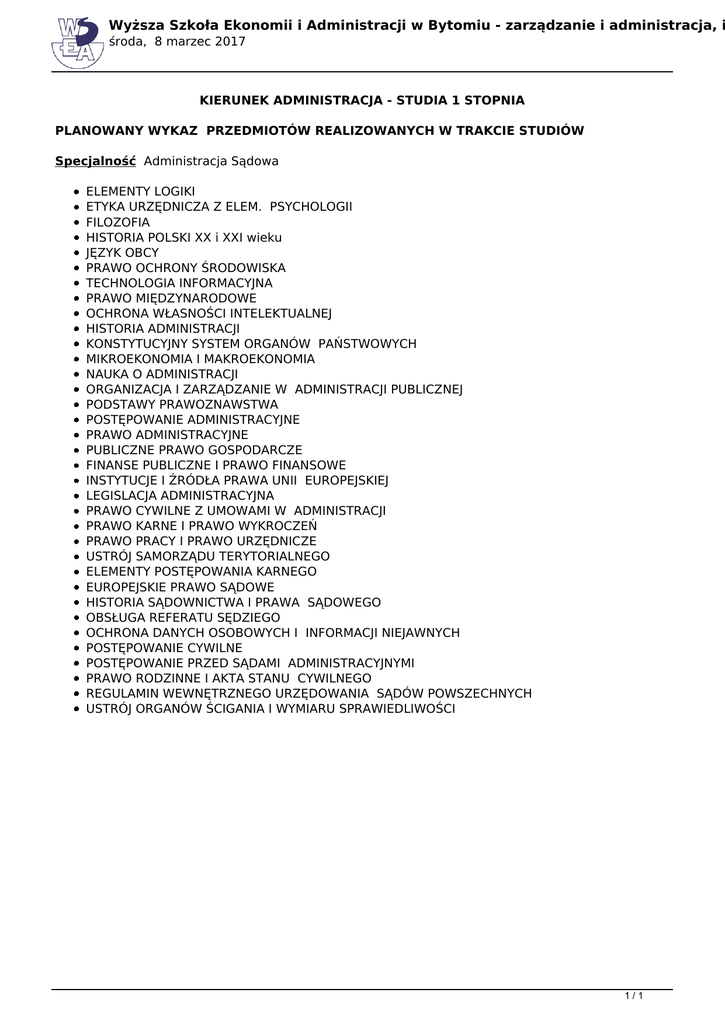 Wyższa Szkoła Ekonomii i Administracji w Bytomiu - zarządzanie i administracja, i środa, 8 marzec 2017 KIERUNEK ADMINISTRACJA - STUDIA 1 STOPNIA PLANOWANY WYKAZ PRZEDMIOTÓW REALIZOWANYCH W TRAKCIE STUDIÓW Specjalność Administracja Sądowa ELEMENTY LOGIKI ETYKA URZĘDNICZA Z ELEM. PSYCHOLOGII FILOZOFIA HISTORIA POLSKI XX i XXI wieku JĘZYK OBCY PRAWO OCHRONY ŚRODOWISKA TECHNOLOGIA INFORMACYJNA PRAWO MIĘDZYNARODOWE OCHRONA WŁASNOŚCI INTELEKTUALNEJ HISTORIA ADMINISTRACJI KONSTYTUCYJNY SYSTEM ORGANÓW PAŃSTWOWYCH MIKROEKONOMIA I MAKROEKONOMIA NAUKA O ADMINISTRACJI ORGANIZACJA I ZARZĄDZANIE W ADMINISTRACJI PUBLICZNEJ PODSTAWY PRAWOZNAWSTWA POSTĘPOWANIE ADMINISTRACYJNE PRAWO ADMINISTRACYJNE PUBLICZNE PRAWO GOSPODARCZE FINANSE PUBLICZNE I PRAWO FINANSOWE INSTYTUCJE I ŹRÓDŁA PRAWA UNII EUROPEJSKIEJ LEGISLACJA ADMINISTRACYJNA PRAWO CYWILNE Z UMOWAMI W ADMINISTRACJI PRAWO KARNE I PRAWO WYKROCZEŃ PRAWO PRACY I PRAWO URZĘDNICZE USTRÓJ SAMORZĄDU TERYTORIALNEGO ELEMENTY POSTĘPOWANIA KARNEGO EUROPEJSKIE PRAWO SĄDOWE HISTORIA SĄDOWNICTWA I PRAWA SĄDOWEGO OBSŁUGA REFERATU SĘDZIEGO OCHRONA DANYCH OSOBOWYCH I INFORMACJI NIEJAWNYCH POSTĘPOWANIE CYWILNE POSTĘPOWANIE PRZED SĄDAMI ADMINISTRACYJNYMI PRAWO RODZINNE I AKTA STANU CYWILNEGO REGULAMIN WEWNĘTRZNEGO URZĘDOWANIA SĄDÓW POWSZECHNYCH USTRÓJ ORGANÓW ŚCIGANIA I WYMIARU SPRAWIEDLIWOŚCI 1/1