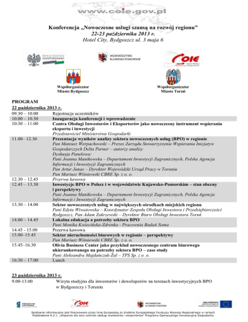 Konferencja „Nowoczesne usługi szansą na rozwój regionu” 22-23 października 2013 r. Hotel City, Bydgoszcz ul. 3 maja 6 Współorganizator Miasto Bydgoszcz Współorganizator Miasto Toruń PROGRAM 22 października 2013 r. 09.30 – 10.00 Rejestracja uczestników 10.00 – 10.30 Inauguracja konferencji i wprowadzenie 10:30 – 11:00 Centra Obsługi Inwestorów i Eksporterów jako nowoczesny instrument wspierania eksportu i inwestycji Przedstawiciel Ministerstwa Gospodarki 11.00– 12.30 Prezentacja wyników analizy sektora nowoczesnych usług (BPO) w regionie Pan Mateusz Werpachowski – Prezes Zarządu Stowarzyszenie Wspierania Inicjatyw Gospodarczych Delta Parner – autorzy analizy Dyskusja Panelowa: Pani Joanna Manikowska – Departament Inwestycji Zagranicznych, Polska Agencja Informacji i Inwestycji Zagranicznych Pan Artur Janas – Dyrektor Wojewódzki Urząd Pracy w Toruniu Pan Mariusz Wiśniewski CBRE Sp. z o. o. 12.30 – 12.45 Przerwa kawowa 12.45 – 13.30 Inwestycje BPO w Polsce i w województwie Kujawsko-Pomorskim – stan obecny i perspektywy Pani Joanna Manikowska – Departament Inwestycji Zagranicznych, Polska Agencja Informacji i Inwestycji Zagranicznych 13.30 – 14.00 Sektor nowoczesnych usług w największych ośrodkach miejskich regionu Pani Edyta Wiwatowska – Koordynator Zespołu Obsługi Inwestora i Przedsiębiorczości Bydgoszcz, Pan Adam Zakrzewski – Dyrektor Biuro Obsługi Inwestora Toruń 14.00 – 14.45 Lokalna edukacja a potrzeby sektora BPO Pani Monika Kwiecińska-Zdrenka - Pracownia Badań Soma 14.45 - 15.00 Przerwa kawowa 15.00–15.45 Sektor nieruchomości biurowych w regionie – perspektywy Pan Mariusz Wiśniewski CBRE Sp. z o. o. 15.45–16.30 Olivia Business Center jako przykład nowoczesnego centrum biurowego ukierunkowanego na potrzeby sektora BPO – case study Pani Aleksandra Majdańczuk-Żal – TPS Sp. z o. o. 16:30 – 17:00 Lunch 23 października 2013 r. 9.00-13.00 Wizyta studyjna dla inwestorów i deweloperów na terenach inwestycyjnych BPO w Bydgoszczy i Toruniu Spotkanie informacyjne jest finansowane przez Unię Europejską ze środków Europejskiego Funduszu Rozwoju Regionalnego w ramach Poddziałania 6.2.1. „Wsparcie dla sieci centrów obsługi inwestorów i eksporterów” Programu Operacyjnego Innowacyjna Gospodarka