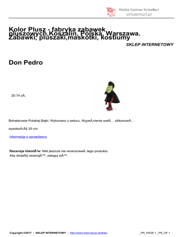 Kolor Plusz - fabryka zabawek pluszowych,Koszalin, Polska, Warszawa. Zabawki, pluszaki,maskotki, kostiumy SKLEP INTERNETOWY Don Pedro 20.74 zÅ‚ Bohaterowie Polskiej Bajki. Wykonano z weluru, WypeÅ‚nienie watÄ… silikonowÄ… wysokość 20 cm Informacja o sprzedawcy Recenzje klientów: Nikt jeszcze nie recenzowaÅ‚ tego produktu. Aby dodać recenzjÄ™, zaloguj siÄ™. Copyright ©2017 - SKLEP INTERNETOWY - http://www.kolor-plusz.pl/sklep _PN_PAGE 1 _PN_OF 1