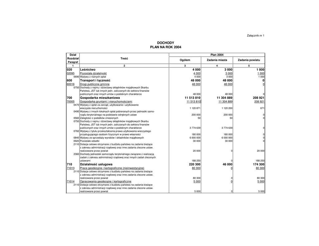Zał cznik nr 1 DOCHODY PLAN NA ROK 2004 Dział Rozdział Plan 2004 Tre Paragraf 1 2 020 Le nictwo 02095 Pozostała działalno 0690 Wpływy z ró nych opłat 600 Transport i ł czno 60016 Drogi publiczne gminne 0750 Dochody z najmu i dzier awy skł dników maj tkowych Skarbu Pa stwa, JST lub innych jedn. zaliczanych do sektora finansów publicznych oraz innych umów o podobnym charakterze 700 Gospodarka mieszkaniowa 70005 Gospodarka gruntami i nieruchomo ciami 0470 Wpływy z opłat za zarz d, u ytkowanie i u ytkowanie wieczyste nieruchomo ci 0490 Wpływy z innych lokalnych opłat pobieranych przez jednostki samorz du terytorialnego na podstawie odr bnych ustaw 0560 Zaległo ci z podatków zniesionych 0750 Dochody z najmu i dzier awy skł dników maj tkowych Skarbu Pa stwa, JST lub innych jedn. zaliczanych do sektora finansów publicznych oraz innych umów o podobnym charakterze 0760 Wpływy z tytułu przekształcenia prawa u ytkowania wieczystego przysługuj cego osobom fizycznym w prawo własno ci 0840 Wpływy ze sprzeda y wyrobów i składników maj tkowych 0920 Pozostałe odsetki 2110 Dotacje celowe otrzymane z bud etu pa stwa na zadania bie ce z zakresu administracji rz dowej oraz inne zadania zlecone ustaw. realizowane przez powiat 2360 Dochody jednostek samorz du terytorialnego zwi zane z realizacj zada z zakresu administracji rz dowej oraz innych zada zleconych ustawami 710 Działalno 71013 usługowa Prace geodezyjne i kartograficzne (nieinwestycyjne) 2110 Dotacje celowe otrzymane z bud etu pa stwa na zadania bie ce z zakresu administracji rz dowej oraz inne zadania zlecone ustaw. realizowane przez powiat 71014 Opracowania geodezyjne i kartograficzne 2110 Dotacje celowe otrzymane z bud etu pa stwa na zadania bie ce z zakresu administracji rz dowej oraz inne zadania zlecone ustaw. realizowane przez powiat Ogółem 3 Zadania miasta Zadania powiatu 4 5 4 000 3 000 1 000 4 000 3 000 1 000 4 000 3 000 1 000 48 000 48 000 0 48 000 48 000 0 48 000 48 000 0 11 513 810 11 304 889 208 921 11 513 810 11 304 889 208 921 1 120 871 1 120 200 671 200 000 50 200 000 50 0 0 3 774 639 3 774 639 0 180 000 6 000 000 30 000 180 000 6 000 000 30 000 0 0 0 20 000 0 20 000 188 250 0 188 250 220 300 46 000 174 300 80 300 0 80 300 80 300 0 80 300 5 000 0 5 000 5 000 0 5 000 1 71015 2 Nadzór budowlany 0690 Wpływy z ró nych opłat 2110 Dotacje celowe otrzymane z bud etu pa stwa na zadania bie ce z zakresu administracji rz dowej oraz inne zadania zlecone ustaw. realizowane przez powiat 6410 Dotacje celowe przekazane z bud etu pa stwa na inwestycje i zakupy inwestycyjne z zakresu administracji rz dowej oraz inne zadania zlecone ustawami realizowane przez powiat 71035 Cmentarze 0690 Wpływy z ró nych opłat 2020 Dotacje celowe przekazane z bud etu pa stwa na zadania bie ce realizowane przez gmin na podstawie porozumienie z organami administracji rz dowej 71095 Pozostała działalno 0830 Wpływy z usług 750 Administracja publiczna 75011 Urz dy wojewódzkie 2010 Dotacje celowe otrzymane z bud etu pa stwa na realizacj zada bie cych z zakresu administracji rz dowej oraz innych zada zleconych gminie (zw.gmin) ustawami 2110 Dotacje celowe otrzymane z bud etu pa stwa na zadania bie ce z zakresu administracji rz dowej oraz inne zadania zlecone ustaw. realizowane przez powiat 2360 Dochody jednostek samorz du terytorialnego zwi zane z realizacj zada z zakresu administracji rz dowej oraz innych zada zleconych ustawami 75020 Starostwa powiatowe 0690 Wpływy z ró nych opłat 75023 Urz dy gmin (miast i miast na prawach powiatu) 0590 Wpływy z opłat za koncesje i licencje 0690 Wpływy z ró nych opłat 0970 Wpływy z ró nych dochodów 75045 Komisje poborowe 2110 Dotacje celowe otrzymane z bud etu pa stwa na zadania bie ce z zakresu administracji rz dowej oraz inne zadania zlecone ustaw. realizowane przez powiat 2120 Dotacje celowe otrzymane z bud etu pa stwa na zadania bie ce realizowane przez powiat na podstawie porozumie z organami administracji rz dowej 751 Urz dy naczelnych organów władzy pa stwowej, kontroli i ochrony prawa oraz s downictwa 75101 Urz dy naczelnych organów władzy pa stwowej, kontroli i ochrony prawa 2010 Dotacje celowe otrzymane z bud etu pa stwa na realizacj zada bie cych z zakresu administracji rz dowej oraz innych zada zleconych gminie (zw.gmin) ustawami 3 4 5 89 000 0 89 000 2 000 0 2 000 83 000 0 83 000 4 000 0 4 000 45 000 45 000 0 45 000 45 000 0 0 0 0 1 000 1 000 0 1 000 1 000 0 728 698 554 258 174 440 581 498 446 558 134 940 436 308 436 308 0 134 900 0 134 900 10 290 10 250 40 12 500 0 12 500 12 500 0 12 500 107 700 107 700 0 14 500 93 000 200 14 500 93 000 200 0 0 0 27 000 0 27 000 23 000 0 23 000 4 000 0 4 000 9 998 9 998 0 9 998 9 998 0 9 998 9 998 0 1 2 754 Bezpiecze stwo publiczne i ochrona przeciwpo ar. 75411 Komendy powiatowe Pa stwowej Stra y Po arnej 2110 Dotacje celowe otrzymane z bud etu pa stwa na zadania bie ce z zakresu administracji rz dowej oraz inne zadania zlecone ustaw. realizowane przez powiat 75414 Obrona cywilna 2010 Dotacje celowe otrzymane z bud etu pa stwa na realizacj zada bie cych z zakresu administracji rz dowej oraz innych zada zleconych gminie (zw.gmin) ustawami 75416 Stra Miejska 0570 Grzywny, mandaty i inne kary pieni ne od ludno ci 756 Dochody od osób prawnych, od osób fizycznych i od innych jednostek nieposiadaj cych osobowo ci prawnej oraz wydatki zwi zane z ich poborem 75601 Wpływy z podatku dochodowego od osób fizycznych 0350 Pod.od dział.gosp. os. fiz. opłacany w form.karty podatkowej 75615 Wpływy z podatku rolnego, podatku le nego, podatku od czynno ci cywilnoprawnych oraz podatku od spodków i darowizn oraz podatków i opłat lokalnych 2440 Dotacje otrzymane z funduszy celowych na realizacje zada bie cych jednostek sektora finansów publicznych 0310 Podatek od nieruchomo ci 0320 Podatek rolny 0330 Podatek le ny 0340 Podatek od rodków transportowych 0360 Podatek od spadków i darowizn 0370 Podatek od posiadania psów 0430 Wpływy z opłat
