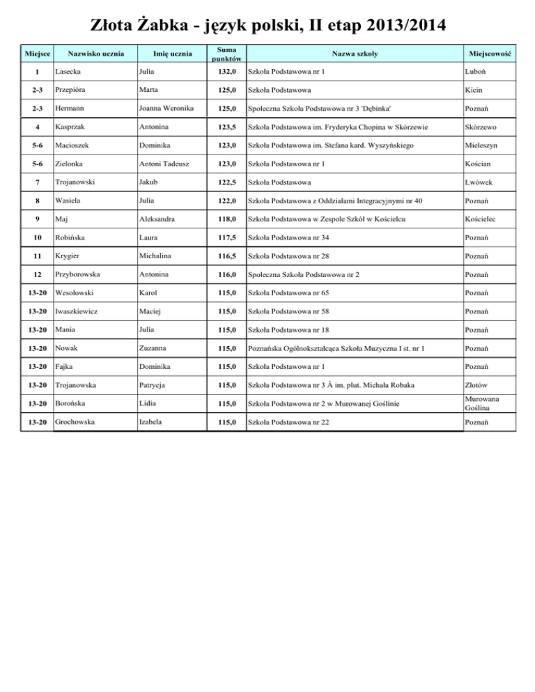 Złota Żabka - język polski, II etap 2013/2014 Miejsce Nazwisko ucznia Imię ucznia Suma punktów Nazwa szkoły Miejscowość 1 Lasecka Julia 132,0 Szkoła Podstawowa nr 1 Luboń 2-3 Przepióra Marta 125,0 Szkoła Podstawowa Kicin 2-3 Hermann Joanna Weronika 125,0 Społeczna Szkoła Podstawowa nr 3 'Dębinka' Poznań 4 Kasprzak Antonina 123,5 Szkoła Podstawowa im. Fryderyka Chopina w Skórzewie Skórzewo 5-6 Macioszek Dominika 123,0 Szkoła Podstawowa im. Stefana kard. Wyszyńskiego Mieleszyn 5-6 Zielonka Antoni Tadeusz 123,0 Szkoła Podstawowa nr 1 Kościan 7 Trojanowski Jakub 122,5 Szkoła Podstawowa Lwówek 8 Wasiela Julia 122,0 Szkoła Podstawowa z Oddziałami Integracyjnymi nr 40 Poznań 9 Maj Aleksandra 118,0 Szkoła Podstawowa w Zespole Szkół w Kościelcu Kościelec 10 Robińska Laura 117,5 Szkoła Podstawowa nr 34 Poznań 11 Krygier Michalina 116,5 Szkoła Podstawowa nr 28 Poznań 12 Przyborowska Antonina 116,0 Społeczna Szkoła Podstawowa nr 2 Poznań 13-20 Wesołowski Karol 115,0 Szkoła Podstawowa nr 65 Poznań 13-20 Iwaszkiewicz Maciej 115,0 Szkoła Podstawowa nr 58 Poznań 13-20 Mania Julia 115,0 Szkoła Podstawowa nr 18 Poznań 13-20 Nowak Zuzanna 115,0 Poznańska Ogólnokształcąca Szkoła Muzyczna I st. nr 1 Poznań 13-20 Fajka Dominika 115,0 Szkoła Podstawowa nr 1 Poznań 13-20 Trojanowska Patrycja 115,0 Szkoła Podstawowa nr 3 Â im. plut. Michała Robaka Złotów 13-20 Borońska Lidia 115,0 Szkoła Podstawowa nr 2 w Murowanej Goślinie Murowana Goślina 13-20 Grochowska Izabela 115,0 Szkoła Podstawowa nr 22 Poznań 21 Piotrowska Florentyna 114,5 Dwujęzyczna Polsko-Angielska Prywatna Szkoła Podstawowa Poznań 22 Kamowska Patrycja 114,0 Szkoła Podstawowa nr 54 Poznań 23 Janowska Julia 112,5 Szkoła Podstawowa nr 11 Poznań 24 Pawłowska Urszula 111,5 Szkoła Podstawowa nr 79 Poznań 25 Świdzińska Jagoda 111,0 Szkoła Podstawowa nr 1 Luboń 26 Łęcka Antonina Agnieszka 111,0 Społeczna Szkoła Podstawowa nr 3 'Dębinka' Poznań 27 Tomczyk Karolina 111,0 Piątkowska Szkoła Społeczna Poznań 28 Gawrysiak Zuzanna 110,5 Szkoła Podstawowa nr 1 Luboń 29 Maziarz Roksana 110,5 Szkoła Podstawowa nr 10 Poznań 30 Nowakowska Julia 110,0 Szkoła Podstawowa nr 55 Poznań 31 Tuchołka Tomasz 109,5 Publiczna Szkoła Podstawowa Zakonu Pijarów Poznań 32 Waliszka Anna 109,5 Szkoła Podstawowa Nekla 33 Wlazło Dorota 109,0 Szkoła nr 83 'Łejery' Poznań 34 Gąsior Aleksandra 108,0 Szkoła Podstawowa nr 4 im. Wł. Broniewskiego w Rawiczu Rawicz 35 Kruszewska Weronika 108,0 Szkoła Podstawowa nr 6 z Oddziałami Integracyjnymi Poznań 36 Przybylski Mikołaj 107,0 Samorządowa Szkoła Podstawowa nr 1 We Wrześni Września 37 Wódz Olimpia 107,0 Szkoła Podstawowa nr 1 im. St. Staszica Złotów 38 Zachmann - Mokry Martyna 107,0 Szkoła Podstawowa nr 46 Poznań 39 Konarska Agata 107,0 Szkoła Podstawowa nr 5 Swarzędz 40 Pawlikowska Agnieszka 107,0 Publiczna Szkoła Podstawowa Zakonu Pijarów Poznań 41 Kapałka Julia 106,0 Szkoła Podstawowa w Dusznikach Duszniki 42 Nowak Julia 106,0 Szkoła Podstawowa nr 3 Środa Wielkopolska 43 Kozak Jakub 106,0 Społeczna Szkoła Podstawowa nr 1 Poznań 44 Ślugaj Faustyna 105,5 Społeczna Szkoła Podstawowa w Grzybowie Grzybowo 45 Żebrowska Agnieszka 105,0 Szkoła Podstawowa nr 90 Poznań 46 Gawrysiak Mateusz 104,5 Szkoła Podstawowa nr 1 Luboń 47 Kosturski Łukasz 104,0 Szkoła Podstawowa nr 1 Swarzędz 48 Bąk Anna 103,5 Publiczna Salezjańska Szkoła Podstawowa Poznań 49 Komin Zuzanna 103,5 Szkoła Podstawowa Opalenica 50 Biskup Julia 103,0 Samorządowa Szkoła Podstawowa nr 6 Września 51 Kaczmarek Zofia 103,0 SP w Wirach Wiry 52 Kochanka Weronika 102,0 Szkoła Podstawowa im. Adama Wodziczki w Rogalinku Rogalinek 53 Tomaszyk Anna 101,5 Szkoła Podstawowa im. Bohaterów Westerplatte Czempiń 54 Król Mateusz 101,5 Publiczna Szkoła Podstawowa Zakonu Pijarów Poznań 55 Liberda Aleksandra 101,0 Zespół Szkół Da Vinci Szkoła Podstawowa Poznań 56 Brambor Jakub 101,0 Szkoła Podstawowa nr 3 Środa Wielkopolska 57 Mieczkowski Maciej 100,5 Szkoła Podstawowa w Tarnowie Podgórnym Tarnowo Podgórne 58 Łukaszewska Olga 100,0 Szkoła Podstawowa nr 66 Poznań 59 Witczak Wiktoria 100,0 Szkoła Podstawowa nr 2 Puszczykowo 60 Jasiński Jakub 99,5 Szkoła Podstawowa nr 1 w Kórniku Kórnik 61 Olender Aleksandra 99,0 Szkoła Podstawowa nr 2 Nowy Tomyśl 62 Kaczmarek Szymon 99,0 Szkoła Pdstawowa im. Gen. Jozefa Dowbora Muśnickiego w Lusowie Lusowo 63 Wiśniewska Marta 98,5 Publiczna Salezjańska Szkoła Podstawowa Poznań 64 Makoweńska Zofia Anna 98,0 Szkoła Podstawowa nr 77 Poznań 65 Potocka Nadia 97,5 Szkoła Podstawowa w Brodnicy Brodnica 66 Gołas Julia 97,0 Szkoła Podstawowa nr 12 Gniezno 67 Dobraś Matylda 96,5 Katolicka Publiczna Szkoła Podstawowa im. Jana Pawła II Śrem 68 Korzycki Mikołaj 95,0 Szkoła Podstawowa im. Jana Kilińskiego Trzemeszno 69 Konieczna Zuzanna 94,5 Szkoła Podstawowa nr 17 Poznań 70 Borowska-Dobrowolska Dominika 94,0 Szkoła Podstawowa w Czerwonaku Czerwonak 71 Olejniczak Mateusz 93,0 Szkoła Podstawowa w Dopiewie Dopiewo 72 Konik Alicja 89,0 Szkoła Podstawowa nr 2 Puszczykowo 73 Sybilski Remigiusz 88,5 Zespół Szkół w Otocznej Samorządowa Szkoła Podstawowa Otoczna 74 Skrzypczak Joanna 87,0 Szkoła Podstawowa nr 1 im. Polskich Olimpijczyków Grodzisk Wlkp. 75 Kubasiewicz Julia 87,0 Samorządowa Szkoła Podstawowa Pyzdry 76 Galasińska Joanna 86,5 Szkoła Podstawowa nr 84 Poznań 77 Jańczak Zofia 86,0 Szkoła Podstawowa nr 3 Środa Wielkopolska 78 Gałek Urszula 85,5 Szkoła Podstawowa nr 64 Poznań 79 Wyrwa Laura 84,0 Szkoła Podstawowa im. Powstańców Wlkp. Miedzichowo 80 Szymanek Katarzyna 83,5 Szkoła Podstawowa nr 2 z Oddziałami Integracyjnymi Środa Wielkopolska 81 Kaczmarczyk Jagoda 83,0 Poznańska Ogólnokształcąca Szkoła Muzyczna I st. nr 2 Poznań 82 Podsadna Julia 82,5 Szkoła Podstawowa nr 1 w Kórniku Kórnik 83 Figlerowicz Jakub 82,0 Publiczna Szkoła Podstawowa Zakonu Pija