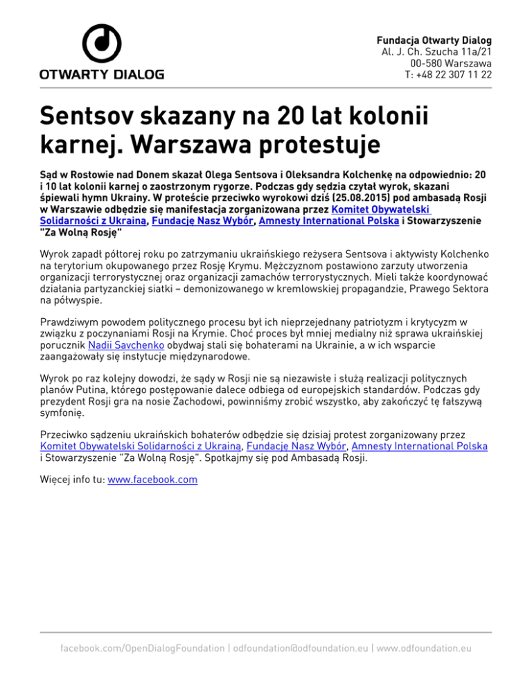 Fundacja Otwarty Dialog Al. J. Ch. Szucha 11a/21 00-580 Warszawa T: +48 22 307 11 22 Sentsov skazany na 20 lat kolonii karnej. Warszawa protestuje Sąd w Rostowie nad Donem skazał Olega Sentsova i Oleksandra Kolchenkę na odpowiednio: 20 i 10 lat kolonii karnej o zaostrzonym rygorze. Podczas gdy sędzia czytał wyrok, skazani śpiewali hymn Ukrainy. W proteście przeciwko wyrokowi dziś (25.08.2015) pod ambasadą Rosji w Warszawie odbędzie się manifestacja zorganizowana przez Komitet Obywatelski Solidarności z Ukrainą, Fundację Nasz Wybór, Amnesty International Polska i Stowarzyszenie "Za Wolną Rosję" Wyrok zapadł półtorej roku po zatrzymaniu ukraińskiego reżysera Sentsova i aktywisty Kolchenko na terytorium okupowanego przez Rosję Krymu. Mężczyznom postawiono zarzuty utworzenia organizacji terrorystycznej oraz organizacji zamachów terrorystycznych. Mieli także koordynować działania partyzanckiej siatki – demonizowanego w kremlowskiej propagandzie, Prawego Sektora na półwyspie. Prawdziwym powodem politycznego procesu był ich nieprzejednany patriotyzm i krytycyzm w związku z poczynaniami Rosji na Krymie. Choć proces był mniej medialny niż sprawa ukraińskiej porucznik Nadii Savchenko obydwaj stali się bohaterami na Ukrainie, a w ich wsparcie zaangażowały się instytucje międzynarodowe. Wyrok po raz kolejny dowodzi, że sądy w Rosji nie są niezawisłe i służą realizacji politycznych planów Putina, którego postępowanie dalece odbiega od europejskich standardów. Podczas gdy prezydent Rosji gra na nosie Zachodowi, powinniśmy zrobić wszystko, aby zakończyć tę fałszywą symfonię. Przeciwko sądzeniu ukraińskich bohaterów odbędzie się dzisiaj protest zorganizowany przez Komitet Obywatelski Solidarności z Ukrainą, Fundację Nasz Wybór, Amnesty International Polska i Stowarzyszenie "Za Wolną Rosję". Spotkajmy się pod Ambasadą Rosji. Więcej info tu: www.facebook.com facebook.com/OpenDialogFoundation | [email protected] | www.odfoundation.eu