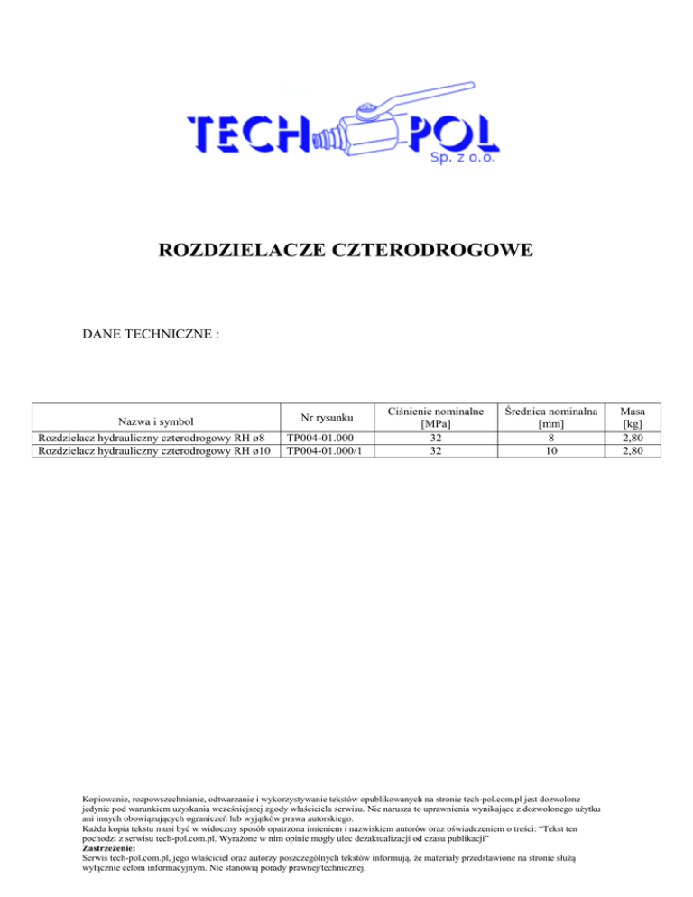 ROZDZIELACZE CZTERODROGOWE DANE TECHNICZNE : Nazwa i symbol Nr rysunku Rozdzielacz hydrauliczny czterodrogowy RH ø8 Rozdzielacz hydrauliczny czterodrogowy RH ø10 TP004-01.000 TP004-01.000/1 Ciśnienie nominalne [MPa] 32 32 Średnica nominalna [mm] 8 10 Kopiowanie, rozpowszechnianie, odtwarzanie i wykorzystywanie tekstów opublikowanych na stronie tech-pol.com.pl jest dozwolone jedynie pod warunkiem uzyskania wcześniejszej zgody właściciela serwisu. Nie narusza to uprawnienia wynikające z dozwolonego użytku ani innych obowiązujących ograniczeń lub wyjątków prawa autorskiego. Każda kopia tekstu musi być w widoczny sposób opatrzona imieniem i nazwiskiem autorów oraz oświadczeniem o treści: “Tekst ten pochodzi z serwisu tech-pol.com.pl. Wyrażone w nim opinie mogły ulec dezaktualizacji od czasu publikacji” Zastrzeżenie: Serwis tech-pol.com.pl, jego właściciel oraz autorzy poszczególnych tekstów informują, że materiały przedstawione na stronie służą wyłącznie celom informacyjnym. Nie stanowią porady prawnej/technicznej. Masa [kg] 2,80 2,80