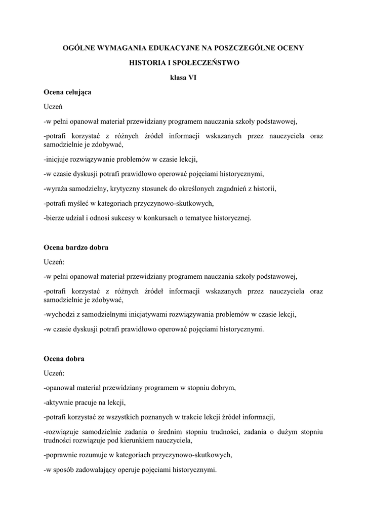 OGÓLNE WYMAGANIA EDUKACYJNE NA POSZCZEGÓLNE OCENY HISTORIA I SPOŁECZEŃSTWO klasa VI Ocena celująca Uczeń -w pełni opanował materiał przewidziany programem nauczania szkoły podstawowej, -potrafi korzystać z różnych źródeł informacji wskazanych przez nauczyciela oraz samodzielnie je zdobywać, -inicjuje rozwiązywanie problemów w czasie lekcji, -w czasie dyskusji potrafi prawidłowo operować pojęciami historycznymi, -wyraża samodzielny, krytyczny stosunek do określonych zagadnień z historii, -potrafi myśleć w kategoriach przyczynowo-skutkowych, -bierze udział i odnosi sukcesy w konkursach o tematyce historycznej. Ocena bardzo dobra Uczeń: -w pełni opanował materiał przewidziany programem nauczania szkoły podstawowej, -potrafi korzystać z różnych źródeł informacji wskazanych przez nauczyciela oraz samodzielnie je zdobywać, -wychodzi z samodzielnymi inicjatywami rozwiązywania problemów w czasie lekcji, -w czasie dyskusji potrafi prawidłowo operować pojęciami historycznymi. Ocena dobra Uczeń: -opanował materiał przewidziany programem w stopniu dobrym, -aktywnie pracuje na lekcji, -potrafi korzystać ze wszystkich poznanych w trakcie lekcji źródeł informacji, -rozwiązuje samodzielnie zadania o średnim stopniu trudności, zadania o dużym stopniu trudności rozwiązuje pod kierunkiem nauczyciela, -poprawnie rozumuje w kategoriach przyczynowo-skutkowych, -w sposób zadowalający operuje pojęciami historycznymi. Ocena dostateczna Uczeń: -opanował podstawowe wiadomości programowe pozwalające najważniejszych zagadnień przewidzianych w programie klasy VI, mu na rozumienie -potrafi pod kierunkiem nauczyciela skorzystać z podstawowych informacji, -wykonuje proste zadania, -konstruuje krótkie wypowiedzi na tematy historyczne, -w czasie lekcji wykazuje się aktywnością w stopniu zadowalającym. Ocena dopuszczająca Uczeń -posiada poważne braki, które jednak można usunąć w dalszym okresie, -potrafi przy pomocy nauczyciela wykonywać proste polecenia, wymagające zastosowania podstawowych umiejętności, -konstruuje krótkie wypowiedzi. Ocena niedostateczna Uczeń: -nie opanował podstawowych wiadomości, a braki są tak duże, że uniemożliwiają mu kontynuację nauki, -nawet przy pomocy nauczyciela nie potrafi wykonać prostych poleceń wymagających zastosowania podstawowych umiejętności.