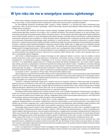 Postrzeganie teraźniejszości W tym roku nie ma w energetyce sezonu ogórkowego Mimo okresu letniego zwanego dawniej sezonem ogórkowym wiele się wokół spraw energetycznych dzieje. Już przyzwyczailiśmy się do tego, że słowa bezpieczeństwo energetyczne odmieniane są przez prawie wszystkie przypadki. Do świnoujskiego gazoportu przypływają statki z gazem z krajów arabskich, a w domyśle jest import skroplonego gazu łupkowego z USA, toczą się rozmowy o gazociągu z Morza Północnego. Sprawa dywersyfikacji źródeł dostawy gazu ziemnego wydaje się być rozwiązana. Trudno odnieść takie wrażenie, jeśli chodzi o sprawy naszego „drogiego” górnictwa węgla, zwłaszcza kamiennego. Pozornie ucichły sprawy górnictwa, pozornie, bo nie wiele o nich w mediach centralnych. Nie oznacza to jednak, że nic się nie dzieje. W połowie lipca rząd przyjął na przykład projekt kolejnej nowelizacji ustawy o funkcjonowaniu górnictwa węgla kamiennego przedłożony przez ministra energii. Zawiera on nowe zobowiązania dla budżetu państwa, umożliwia bowiem finansowanie z dotacji budżetowej naprawianie szkód górniczych powstałych w trakcie likwidacji kopalń. Zaproponowane rozwiązania pozwolą także między innymi na uruchamianie finansowania budżetowego zadań określonych w ustawie górniczej – świadczeń osłonowych w postaci urlopów górniczych i urlopów dla pracowników zakładu przeróbki mechanicznej węgla oraz pokrycia bieżących strat produkcyjnych przedsiębiorstwa z właściwej części budżetowej będącej w dyspozycji ministra energii. Widać więc, że ciągle jeszcze są niezbędne dotacje budżetowe ratujące te nasze firmy wydobywające „czarne złoto”. Nie udaje się także zahamować importu węgla, w tym i niespełniającego polskich wymagań jakościowych, z UE lub państw trzecich, jak w wystąpieniach władz określana jest Rosja. Złośliwi mogą natomiast twierdzić, że dotacje budżetowe muszą zastępować marnotrawione setki milionów wyprowadzanych na usługi doradcze oraz ekspertyzy prawne i techniczne czy przytulny hotelik „Różany Gaj” w Gdyni, jak to wykazał raport z audytu w Jastrzębskiej Spółce Węglowej. Jeśli chodzi o elektroenergetykę, to ciekawe informacje ze sfer rządowych dotarły w czerwcu i lipcu do mediów na temat planów stworzenia w kraju mody na auta elektryczne. Wicepremier, wiceminister rozwoju i minister energii stwierdzili w różnych wystąpieniach, że istnieją plany rządowe zakładające, że za 10 lat po naszym kraju jeździć będzie milion samochodów elektrycznych, a ich eksploatacja wygenerować ma 2 miliardy przychodów dla spółek energetycznych. Jak uważa minister pojazdy tego rodzaju pozwolą na zaspokojenie codziennych potrzeb komunikacyjnych polskich rodzin, a dodatkowo umożliwią redukcję poziomu zanieczyszczeń. Podkreślał, że polscy naukowcy od zawsze słynęli z nowatorskich posunięć i „jednym skokiem potrafili pokonywać dwa, trzy piętra. (...) Teraz też jest takie oczekiwanie”. Poparł te wypowiedzi wicepremier, który stwierdził z kolei także, że elektromobilność Polaków może być „kołem zamachowym polskiej gospodarki i polskiej reindustrializacji”. Tymczasem w 2014 r. sprzedano w Polsce około 100 samochodów elektrycznych. Warto przyjrzeć się, jak temat samochodów elektrycznych rozwiązują Niemcy. Otóż w umowie koalicyjnej rządu Angeli Merkel z 2013 roku CDU/CSU i SPD zobowiązały się do zwiększenia do 2020 roku liczby samochodów elektrycznych do jednego miliona. Na początku roku 2016 w Niemczech zarejestrowanych było 25,5 tys. samochodów elektrycznych i 130 tys. modeli hybrydowych. Liczba wszystkich aut w Niemczech wynosi 45 mln. Trudności z realizacją zobowiązań wyborczych i zbliżanie się terminu kolejnych wyborów w Niemczech stały się prawdopodobną przyczyną uruchomienia w maju 2016 roku rządowego programu przewidującego dopłaty i ulgi podatkowe dla osób decydujących się na zakup auta elektrycznego. Dopłata będzie finansowana po połowie przez rząd i branżę motoryzacyjną. Dopłaty będą obowiązywać najpóźniej do 30 czerwca 2019 roku lub do wyczerpania przewidzianej na ten cel puli środków, wynoszącej 1,2 mld euro. Kupujący musi zatrzymać samochód przez co najmniej 9 miesięcy. Posiadacze samochodów elektrycznych zostaną zwolnieni przez 10 lat z podatku od pojazdów mechanicznych. Ponadto powstać ma 15 tysięcy stacji do ładowania samochodów. Na ten cel rząd przeznaczył ok. 300 mln euro w latach 2017-2020. Władze liczą, że liczba aut elektrycznych zwiększy się o 300 tys. Osiągnięcie liczby miliona samochodów elektrycznych w roku 2020 mimo tak wysokiego zastrzyku finansowego wydaje się jednak mało prawdopodobne. W świetle doświadczeń niemieckich, a także faktu, że dość względny sukces samochodów elektrycznych w Norwegii czy „opętanej” ekologią Kalifornii nie wynikał z obiektywnych zalet tych samochodów, czy ich konkurencyjności, a był między innymi efektem ulg i bonusów, osiągnięcie celu, o jakim wspominali prominentni przedstawiciele rządu polskiego wydaje się bardzo mało prawdopodobne, a „przeskoczenie trzech pięter” przez polskich naukowców można chyba uznać za licentia poetica. Na początku lipca wreszcie weszła w życie nowelizacja ustawy o OZE. Wprowadza ona wiele zmian w zasadach funkcjonowania prosumentów. Podstawową zmianą jest usunięcie z ustawy o OZE systemu taryf gwarantowanych, a także w przypadku podmiotów objętych definicją prosumenta, również systemu bilansowania z uwzględnieniem sprzedaży niezbilansowanych nadwyżek za 100% ceny hurtowej URE, czyli systemu, który obowiązywał w I półroczu dotychczasowych prosumentów. W zamian dla podmiotów objętych definicją prosumenta został wprowadzony system opustów. Podejrzewać można więc, że celem nowelizacji było zablokowanie rozwoju OZE i troska o to, by prosum