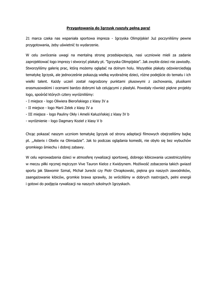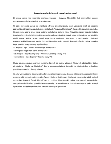 Przygotowania do Igrzysk ruszyły pełną parą! 21 marca czeka nas wspaniała sportowa impreza - Igrzyska Olimpijskie! Już poczyniliśmy pewne przygotowania, żeby uświetnić to wydarzenie. W celu zwrócenia uwagi na mentalną stronę przedsięwzięcia, nasi uczniowie mieli za zadanie zaprojektować logo imprezy i stworzyć plakaty pt. ”Igrzyska Olimpijskie”. Jak zwykle dzieci nie zawiodły. Stworzyliśmy galerię prac, którą możemy oglądać na dolnym holu. Wszystkie plakaty odzwierciedlają tematykę Igrzysk, ale jednocześnie pokazują wielką wyobraźnię dzieci, różne podejście do tematu i ich wielki talent. Każdy uczeń został nagrodzony punktami plusowymi z zachowania, plusikami erasmusowskimi i ocenami bardzo dobrymi lub celującymi z plastyki. Powstały również piękne projekty logo, spośród których cztery wyróżniliśmy: - I miejsce - logo Oliwiera Bierońskiego z klasy IV a - II miejsce - logo Marii Zelek z klasy IV a - III miejsce - logo Pauliny Okły i Amelii Kałuzińskiej z klasy IV b - wyróżnienie - logo Dagmary Kozieł z klasy V b Chcąc pokazać naszym uczniom tematykę Igrzysk od strony adaptacji filmowych obejrzeliśmy bajkę pt. ,,Asterix i Obelix na Olimiadzie”. Jak to podczas oglądania komedii, nie obyło się bez wybuchów gromkiego śmiechu i dobrej zabawy. W celu wprowadzenia dzieci w atmosferę rywalizacji sportowej, dobrego kibicowania uczestniczyliśmy w meczu piłki ręcznej mężczyzn Vive Tauron Kielce z Kwidzynem. Możliwość zobaczenia takich gwiazd sportu jak Sławomir Szmal, Michał Jurecki czy Piotr Chrapkowski, piękna gra naszych zawodników, zaangażowanie kibiców, gromkie brawa sprawiły, że wróciliśmy w dobrych nastrojach, pełni energii i gotowi do podjęcia rywalizacji na naszych szkolnych Igrzyskach.