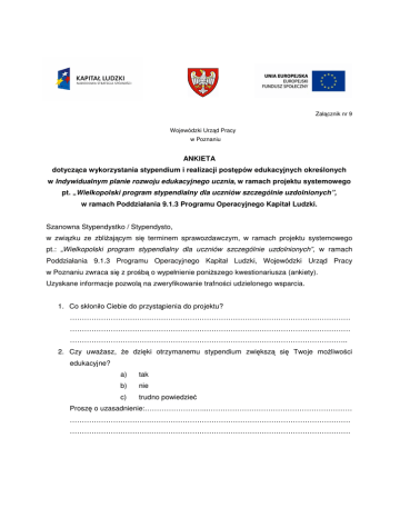 Załącznik nr 9 Wojewódzki Urząd Pracy w Poznaniu ANKIETA dotycząca wykorzystania stypendium i realizacji postępów edukacyjnych określonych w Indywidualnym planie rozwoju edukacyjnego ucznia, w ramach projektu systemowego pt. „Wielkopolski program stypendialny dla uczniów szczególnie uzdolnionych”, w ramach Poddziałania 9.1.3 Programu Operacyjnego Kapitał Ludzki. Szanowna Stypendystko / Stypendysto, w związku ze zbliżającym się terminem sprawozdawczym, w ramach projektu systemowego pt.: „Wielkopolski program stypendialny dla uczniów szczególnie uzdolnionych”, w ramach Poddziałania 9.1.3 Programu Operacyjnego Kapitał Ludzki, Wojewódzki Urząd Pracy w Poznaniu zwraca się z prośbą o wypełnienie poniższego kwestionariusza (ankiety). Uzyskane informacje pozwolą na zweryfikowanie trafności udzielonego wsparcia. 1. Co skłoniło Ciebie do przystąpienia do projektu? ……………………………………………………………………………………………………… ……………………………………………………………………………………………………… …………………………………………………………………………………………………….. 2. Czy uważasz, że dzięki otrzymanemu stypendium zwiększą się Twoje możliwości edukacyjne? a) tak b) nie c) trudno powiedzieć Proszę o uzasadnienie:……………………...…………………………………………………… ……………………………………………………………………………………………………… ……………………………………………………………………………………………………… 3. Czy uważasz, że w porównaniu z innymi uzdolnionymi uczniami, którzy jednak nie otrzymują wsparcia ze środków unijnych masz większe szanse pogłębianie swojej wiedzy i zainteresowań? a) tak b) nie c) trudno powiedzieć Proszę o uzasadnienie:……………………...…………………………………………………… ……………………………………………………………………………………………………… ……………………………………………………………………………………………………… 4. Czy jesteś zadowolona / zadowolony ze sposobu przekazywania informacji na temat projektu pt. „Wielkopolski program stypendialny dla uczniów szczególnie uzdolnionych”? a) tak b) nie c) trudno powiedzieć Proszę o uzasadnienie:……………………...…………………………………………………… ……………………………………………………………………………………………………… ……………………………………………………………………………………………………… 5. Czy uzyskane stypendium pozwoliło na zakup wszystkich elementów niezbędnych Tobie do rozwoju wiedzy i zainteresowań? a) tak b) nie Jeżeli nie, proszę o uzasadnienie:……………………………………………………………… ……………………………………………………………………………………………………… ……………………………………………………………………………………………………… 6. Czy uzyskane stypendium wpłynęło na Twoje decyzje dotyczące przyszłej drogi edukacyjnej / naukowej? a) tak b) nie c) trudno powiedzieć Proszę o uzasadnienie:……………………...…………………………………………………… ……………………………………………………………………………………………………… ……………………………………………………………………………………………………… 7. Czy w przyszłym roku będziesz ponownie aplikowała / aplikował o stypendium finansowane z funduszy Unii Europejskiej? a) tak b) nie c) trudno powiedzieć