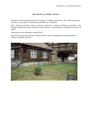 Załącznik nr 1 do zapytania ofertowego Opis okiennicy do chałupy z Królewa Okiennice montowane będą do otworów okiennych w chałupie zabytkowej z XIX wieku pochodzącej z Królewa w gm. Morąg i translokowanej do MBL-PE w Olsztynku. Nowe okiennice powinny wiernie otworzyć zachowane w obiekcie: okiennice drewniane, rama skrzydła wypełniona poziomo listwami na stałe, zawiasy zewnętrzne kątowe, zamkniecie okiennicy od środka. Obramienie otworu okiennego z prostej listwy. Kolorystyka: okiennice pozostają w kolorze drewna, należy je zaimpregnować przed działaniem wilgoci i szkodników drewna.