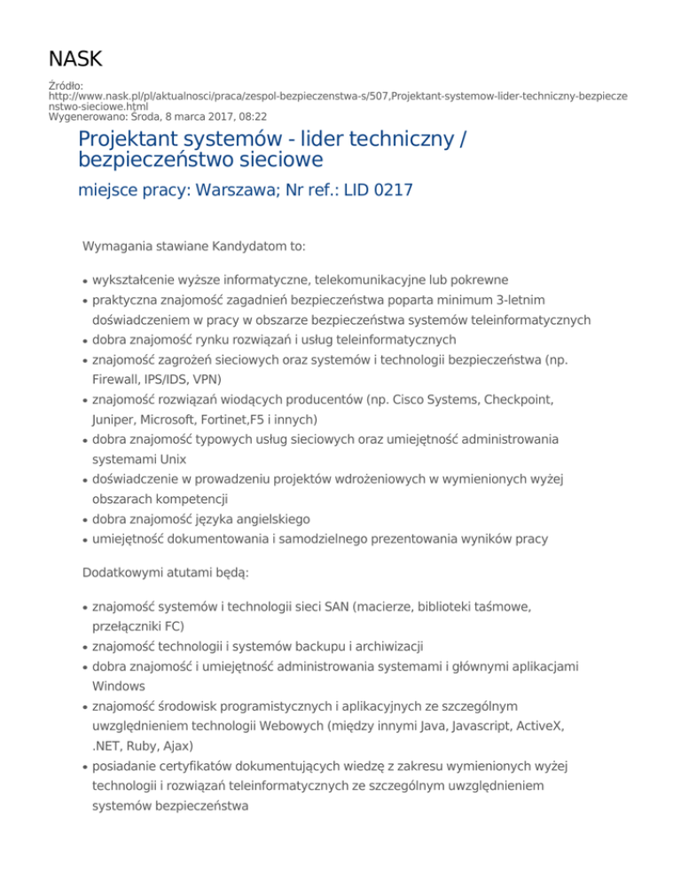 NASK Źródło: http://www.nask.pl/pl/aktualnosci/praca/zespol-bezpieczenstwa-s/507,Projektant-systemow-lider-techniczny-bezpiecze nstwo-sieciowe.html Wygenerowano: Środa, 8 marca 2017, 08:22 Projektant systemów - lider techniczny / bezpieczeństwo sieciowe miejsce pracy: Warszawa; Nr ref.: LID 0217 Wymagania stawiane Kandydatom to: ● wykształcenie wyższe informatyczne, telekomunikacyjne lub pokrewne ● praktyczna znajomość zagadnień bezpieczeństwa poparta minimum 3-letnim doświadczeniem w pracy w obszarze bezpieczeństwa systemów teleinformatycznych ● dobra znajomość rynku rozwiązań i usług teleinformatycznych ● znajomość zagrożeń sieciowych oraz systemów i technologii bezpieczeństwa (np. Firewall, IPS/IDS, VPN) ● znajomość rozwiązań wiodących producentów (np. Cisco Systems, Checkpoint, Juniper, Microsoft, Fortinet,F5 i innych) ● dobra znajomość typowych usług sieciowych oraz umiejętność administrowania systemami Unix ● doświadczenie w prowadzeniu projektów wdrożeniowych w wymienionych wyżej obszarach kompetencji ● dobra znajomość języka angielskiego ● umiejętność dokumentowania i samodzielnego prezentowania wyników pracy Dodatkowymi atutami będą: ● znajomość systemów i technologii sieci SAN (macierze, biblioteki taśmowe, przełączniki FC) ● znajomość technologii i systemów backupu i archiwizacji ● dobra znajomość i umiejętność administrowania systemami i głównymi aplikacjami Windows ● znajomość środowisk programistycznych i aplikacyjnych ze szczególnym uwzględnieniem technologii Webowych (między innymi Java, Javascript, ActiveX, .NET, Ruby, Ajax) ● posiadanie certyfikatów dokumentujących wiedzę z zakresu wymienionych wyżej technologii i rozwiązań teleinformatycznych ze szczególnym uwzględnieniem systemów bezpieczeństwa ● posiadanie aktualnego poświadczenia bezpieczeństwa osobowego ● umiejętność analitycznego myślenia ● umiejętność pracy w grupie ● umiejętność przeprowadzania publicznych prezentacji Do zadań osoby na tym stanowisku należeć będzie między innymi: ● prowadzenie projektów w obszarze bezpieczeństwa teleinformatycznego ● udział w projektach i wdrożeniach systemów teleinformatycznych ● opiniowanie i konsultacje projektów teleinformatycznych pod kątem bezpieczeństwa ● przeprowadzanie audytów i testów bezpieczeństwa systemów teleinformatycznych ● zarządzanie bezpieczeństwem systemów teleinformatycznych ● prowadzenie analiz i przygotowywanie raportów z zakresu bezpieczeństwa teleinformatycznego ● wsparcie techniczne w procesie sprzedaży i przygotowaniu ofert Oferujemy: ● ● możliwość rozwoju i samorealizacji szkolenia, ● miłą atmosferę pracy, ● atrakcyjny pakiet socjalny Zainteresowane osoby prosimy o przesłanie listu motywacyjnego i życiorysu zawodowego opatrzonych klauzulą: „Wyrażam zgodę na przetwarzanie danych osobowych zawartych w mojej ofercie pracy dla potrzeb niezbędnych do realizacji procesu rekrutacji (zgodnie z Ustawą z dn. 29.08.1997 r. o Ochronie Danych Osobowych, Dz. U. Nr 133 poz. 883 z póź. zm.)” na adres e-mail: [email protected] W zgłoszeniach prosimy powoływać się na numer ref.:BPRO 0217, umieszczając go w temacie e-mail. Uprzejmie informujemy, że skontaktujemy się wyłącznie z wybranymi kandydatami.