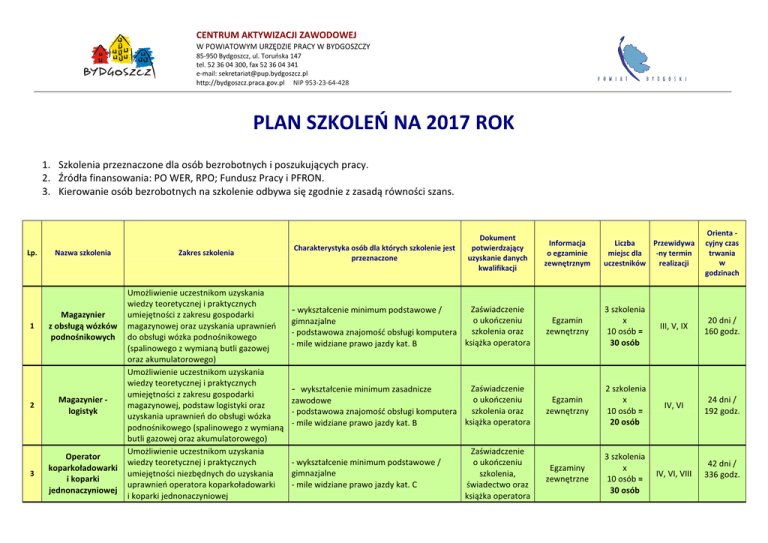 CENTRUM AKTYWIZACJI ZAWODOWEJ W POWIATOWYM URZĘDZIE PRACY W BYDGOSZCZY 85-950 Bydgoszcz, ul. Toruńska 147 tel. 52 36 04 300, fax 52 36 04 341 e-mail: [email protected] http://bydgoszcz.praca.gov.pl NIP 953-23-64-428 PLAN SZKOLEŃ NA 2017 ROK 1. Szkolenia przeznaczone dla osób bezrobotnych i poszukujących pracy. 2. Źródła finansowania: PO WER, RPO; Fundusz Pracy i PFRON. 3. Kierowanie osób bezrobotnych na szkolenie odbywa się zgodnie z zasadą równości szans. Lp. Nazwa szkolenia 1 Magazynier z obsługą wózków podnośnikowych 2 Magazynier logistyk 3 Operator koparkoładowarki i koparki jednonaczyniowej Zakres szkolenia Umożliwienie uczestnikom uzyskania wiedzy teoretycznej i praktycznych umiejętności z zakresu gospodarki magazynowej oraz uzyskania uprawnień do obsługi wózka podnośnikowego (spalinowego z wymianą butli gazowej oraz akumulatorowego) Umożliwienie uczestnikom uzyskania wiedzy teoretycznej i praktycznych umiejętności z zakresu gospodarki magazynowej, podstaw logistyki oraz uzyskania uprawnień do obsługi wózka podnośnikowego (spalinowego z wymianą butli gazowej oraz akumulatorowego) Umożliwienie uczestnikom uzyskania wiedzy teoretycznej i praktycznych umiejętności niezbędnych do uzyskania uprawnień operatora koparkoładowarki i koparki jednonaczyniowej Informacja o egzaminie zewnętrznym Liczba Przewidywa miejsc dla -ny termin uczestników realizacji Orienta cyjny czas trwania w godzinach Zaświadczenie - wykształcenie minimum podstawowe / o ukończeniu gimnazjalne szkolenia oraz - podstawowa znajomość obsługi komputera książka operatora - mile widziane prawo jazdy kat. B Egzamin zewnętrzny 3 szkolenia x 10 osób = 30 osób III, V, IX 20 dni / 160 godz. Zaświadczenie - wykształcenie minimum zasadnicze o ukończeniu zawodowe szkolenia oraz - podstawowa znajomość obsługi komputera książka operatora - mile widziane prawo jazdy kat. B Egzamin zewnętrzny 2 szkolenia x 10 osób = 20 osób IV, VI 24 dni / 192 godz. Egzaminy zewnętrzne 3 szkolenia x 10 osób = 30 osób IV, VI, VIII 42 dni / 336 godz. Charakterystyka osób dla których szkolenie jest przeznaczone - wykształcenie minimum podstawowe / gimnazjalne - mile widziane prawo jazdy kat. C Dokument potwierdzający uzyskanie danych kwalifikacji Zaświadczenie o ukończeniu szkolenia, świadectwo oraz książka operatora CENTRUM AKTYWIZACJI ZAWODOWEJ W POWIATOWYM URZĘDZIE PRACY W BYDGOSZCZY 85-950 Bydgoszcz, ul. Toruńska 147 tel. 52 36 04 300, fax 52 36 04 341 e-mail: [email protected] http://bydgoszcz.praca.gov.pl NIP 953-23-64-428 4 5 6 Spawanie blach i rur spoinami pachwinowymi metodą MAG i TIG Uprawnienia elektryczne – grupa I Prawo jazdy kat. D z kwalifikacją wstępną przyspieszoną w zakresie prawa jazdy kat. D Umożliwienie uczestnikom uzyskania wiedzy teoretycznej i praktycznych umiejętności niezbędnych do uzyskania uprawnień spawacza blach i rur spoinami pachwinowymi metodą MAG (135) i TIG (141) Umożliwienie uczestnikom uzyskania uprawnień z zakresu eksploatacji urządzeń, instalacji i sieci elektroenergetycznych do wykonywania prac w zakresie obsługi, konserwacji, remontów, montażu i kontrolnopomiarowym Umożliwienie uczestnikom uzyskania wiedzy teoretycznej i praktycznych umiejętności niezbędnych do uzyskania uprawnień do wykonywania transportu drogowego - preferowane wykształcenie zasadnicze zawodowe - wykształcenie minimum podstawowe / gimnazjalne - wykształcenie minimum zasadnicze - ukończone 24 lata - posiadanie prawa jazdy kat. B - osoby w stosunku do których nie orzeczono sądowego zakazu wykonywania zawodu kierowcy - osoby, które pozytywnie zakończą proces rekrutacji u pracodawcy: Zaświadczenie o ukończeniu szkolenia, książka spawacza oraz Świadectwo Egzaminu Kwalifikacyjnego Spawacza Egzamin zewnętrzny 4 szkolenia x IV, V, VI, IX 10 osób = 40 osób 29 dni / 232 godz. Zaświadczenie o ukończeniu szkolenia oraz świadectwo kwalifikacyjne Egzamin zewnętrzny 3 szkolenia x 10 osób = 30 osób V, VI, IX 5 dni / 40 godz. Zaświadczenie o ukończeniu szkolenia Egzaminy zewnętrzne 2 szkolenia x 6 osób = 12 osób III, V 221 godz. Zaświadczenie o ukończeniu szkolenia Egzamin zewnętrzny 1 szkolenie x 6 osób = 6 osób IV 2 miesiące / 62 godz. Miejskie Zakłady Komunikacji Sp. z o.o. w Bydgoszczy 7 Pozwolenie do kierowania tramwajem Umożliwienie uczestnikom uzyskania wiedzy teoretycznej i praktycznych umiejętności niezbędnych do uzyskania uprawnień do kierowania tramwajem - wykształcenie minimum zasadnicze zawodowe - ukończone 21 lat - osoby, które pozytywnie zakończą proces rekrutacji u pracodawcy: Miejskie Zakłady Komunikacji Sp. z o.o. w Bydgoszczy CENTRUM AKTYWIZACJI ZAWODOWEJ W POWIATOWYM URZĘDZIE PRACY W BYDGOSZCZY 85-950 Bydgoszcz, ul. Toruńska 147 tel. 52 36 04 300, fax 52 36 04 341 e-mail: [email protected] http://bydgoszcz.praca.gov.pl NIP 953-23-64-428 8 Umożliwienie uczestnikom uzyskania Szkolenie z zakresu wiedzy teoretycznej i praktycznych umiejętności umiejętności z zakresu aktywnego poszukiwania pracy poszukiwania pracy Szkolenie przeznaczone dla osób bezrobotnych, które: - nie posiadają doświadczenia w poszukiwaniu pracy, - utraciły motywację do poszukiwania pracy w związku z długotrwałym niepowodzeniem w jej poszukiwaniu, - chcą powrócić na rynek pracy po długim okresie braku aktywności zawodowej. Zaświadczenie o ukończeniu szkolenia Brak egzaminu zewnętrznego 1 szkolenie x 16 osób = 16 osób 15 dni / 80 godz. IX (40 godz. zajęć warsztatowych i 40 godz. ćwiczeń praktycznych)