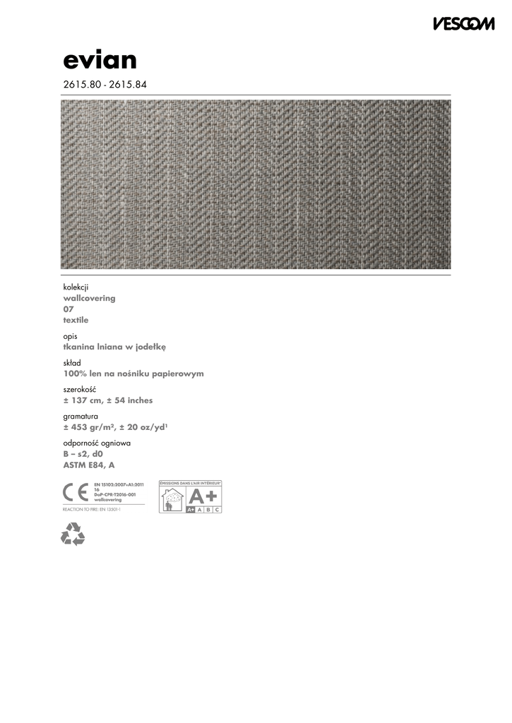 evian 2615.80 - 2615.84 kolekcji wallcovering 07 textile opis tkanina lniana w jodełkę skład 100% len na nośniku papierowym szerokość ± 137 cm, ± 54 inches gramatura ± 453 gr/m², ± 20 oz/yd¹ odporność ogniowa B – s2, d0 ASTM E84, A evian 2615.80 - 2615.84 2615.81 2615.84 2615.83 2615.80 2615.82