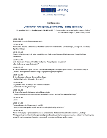 Konferencja „Flexicurity: rynek pracy, prawo pracy i dialog społeczny” 19 grudnia 2012 r. (środa), godz. 10:30-16:00 Centrum Partnerstwa Społecznego „Dialog” ul. Limanowskiego 23, Warszawa, sala A 10:00–10:30 Rejestracja uczestników, poczęstunek 10:30–10:40 Powitanie: Iwona Zakrzewska, Dyrektor Centrum Partnerstwa Społecznego „Dialog” im. Andrzeja Bączkowskiego 10:40–11:10 Otwarcie konferencji: dr hab. Jacek Męcina, Sekretarz Stanu w Ministerstwie Pracy i Polityki Społecznej 11:10–11:40 prof. Kazimierz Frieske, Dyrektor Instytutu Pracy i Spraw Socjalnych „Co się kryje za ideą flexicurity?” 11:40–12:10 dr Lucyna Machol-Zajda, Zakład Zatrudnienia i Rynku Pracy Instytutu Pracy i Spraw Socjalnych „Praca a życie pozazawodowe: regulacja polskiego rynku pracy” 12:10–12:30 dr Jan Czarzasty, Szkoła Główna Handlowa „Duński i holenderski model flexicurity” 12:30-12:50 Krzysztof Getka, Fundacja im. Friedricha Eberta „Niemiecki model flexicurity” 12:50–13:20 dr Adam Tomanek, Uniwersytet w Białymstoku „Flexicurity z perspektywy regionu: doświadczenia z województwa podlaskiego” 13:20–14.00 Lunch 14:00–14:30 Tomasz Kacprzak, Uniwersytet Łódzki „Rola partnerów społecznych we wdrażaniu flexicurity w Polsce” 14:30–16:00 Panel dyskusyjny – prowadzenie: Anna Grabowska, Redaktor Naczelna kwartalnika „Dialog” Wystąpienia przedstawicieli organizacji pracodawców, związków zawodowych, a także instytucji rynku pracy i innych organizacji zainteresowanych rozwojem dialogu społecznego