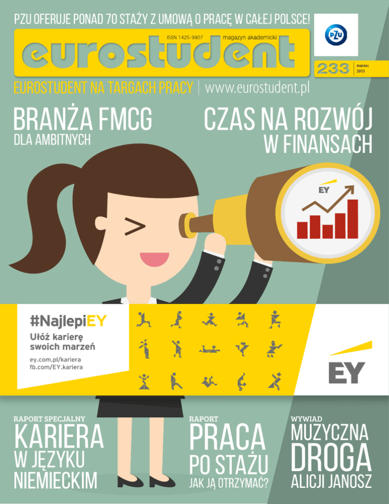 PZU OFERUJE PONAD 70 STAŻY Z UMOWĄ O PRACĘ W CAŁEJ POLSCE! marzec 2015 EUROSTUDENT NA TARGACH PRACY www.eurostudent.pl BRANŻA FMCG DLA AMBITNYCH RAPORT SPECJALNY KARIERA W JĘZYKU NIEMIECKIM CZAS NA ROZWÓJ W FINANSACH RAPORT WYWIAD PO STAŻU JAK JĄ OTRZYMAĆ? DROGA ALICJI JANOSZ PRACA MUZYCZNA Praca po stażu jak ją otrzymać? raport 233 Tekst: Elżbieta Pawelec To właśnie dzięki stażom i praktykom możemy zdobyć pierwsze, cenne doświadczenia zawodowe, i to one niejednokrotnie mają bardzo duży wpływ na nasz rozwój zawodowy. Co jeszcze dają nam praktyki i staże i dlaczego warto brać w nich udział? Dzisiaj, żeby zdobyć dobrą pracę, tytuł magistra i biegły angielski już nie wystarczą. By mieć szanse na dobry start, trzeba być konkurencyjnym. By z kolei takim właśnie być, razem z młodym wiekiem, musimy wykazać się niebanalnym doświadczeniem. – Jak, w jaki sposób??? Przecież to niemożliwe!!! – bulwersują się absolwenci. A jednak możliwe. Rozwiązaniem są staże i praktyki studenckie. po pierwsze: DoświaDczenie Wielu studentów, zatopionych w książkach i notatkach, w pogoni za dobrymi ocenami, przegapia to, czego dziś przegapić nie można: staże i praktyki studenckie. One dają więcej niż dobrze zdana sesja i stypendium naukowe. Dają realną praktykę, a aktualna sytuacja na rynku pracy nie pozostawia wątpliwości… Bez doświadczenia ani rusz. – Pracodawcy prowadzący rekrutację oczekują od absolwentów wyższych uczelni doświadczenia zawodowego, co oznacza, że już w trakcie studiów należy wykazać się aktywnością i kreatywnością w jego zdobywaniu. Wiedza teoretyczna z uczelni MAŁGORZATA TOKARZ tesco (polsKa) sp. z o.o. Kompetencje społeczne są naszym motorem do osiągnięcia sukcesu! Akademia dla Młodych w Polsce wsparła już ponad 16 000 osób w ramach szkoleń e-learningowych, a także 500 osób w ramach bezpośrednich warsztatów, w tym 25 nauczycieli – naszych ambasadorów. Chcemy, by każdy znał swoje talenty, wiedział, co jest jego dźwignią do rozwoju, ale także wiedział, nad którymi kompetencjami powinien pracować. Programy rozwojowe i kompetencyjne są skierowane również do Naszych Koleżanek i Kolegów w TESCO – poprzez to mamy już grupę ponad 7000 młodych, zaangażowanych ludzi. Zapraszamy na stronę www.akademiadlamlodych.pl. powinna być uzupełniona praktyką – wyjaśnia Beata Tymciów p.o. kierownik Referatu Pośrednictwa Zewnętrznego CAZ PUP Wrocław. Podobne stanowisko zajmują obserwatorzy rynku pracy. – Jesteśmy na etapie, kiedy pracodawca poszukuje kandydata wykształconego, a zarazem z doświadczeniem. Najlepszym i najtańszym obecnie sposobem na zdobycie tego doświadczenia są praktyki czy staże. Warto zainwestować w nie jak najwcześniej, próbując własnych sił w różnych branżach i firmach – mówi Malwina Wrotniak- Chałada, zastępca redaktora naczelnego portalu Bankier.pl. – Jeśli, dzięki praktykom, obie strony będą zadowolone z kooperacji, student zyskuje możliwość podjęcia pracy w danej firmie. A jeśli nie ma możliwości zatrudnienia, może być polecony innym osobom w branży – mówi Anna Mazur-Sokół, koordynator Biura Karier Politechniki Lubelskiej. – Prócz okazji do testowania pracy w różnego typu firmach, praktyka to zawsze okazja do sprawdzenia, jak funkcjonujemy w odmiennym środowisku. Bezwzględną korzyścią jest też budowanie sieci kontaktów. Tzw. networking, prędzej czy później, procentuje – zaznacza Malwina Wrotniak-Chałada. MIROSŁAWA WIERZBICKA starszy specjalista Ds. reKrutacji ey Praktyki w EY to dla studentów unikalna możliwość udziału w rzeczywistych projektach dla klientów. W zależności od działu, mogą oni sprawdzić się w wyzwaniach z zakresu audytu, doradztwa podatkowego, biznesowego lub transakcyjnego. Każdy praktykant na początku swojej pracy uzgadnia plan praktyk ze swoim indywidualnym opiekunem. Bazując na ocenie pracy, najbardziej zaangażowane i aktywne osoby mają możliwość otrzymania oferty na stanowisko Asystenta/Konsultanta jeszcze podczas studiów. Z doświadczenia wiem, że praktyki to najlepsza droga do stałej pracy w EY. W tym roku mamy blisko 100 ofert dla praktykantów, więc szanse są duże. MŁODZI LUDZIE W POSZUKIWANIU ORGANIZACJI STAWIAJĄCEJ NA ROZWÓJ I OPARTEJ NA WARTOŚCIACH www.akademiadlamlodych.pl obecnie młodzi ludzie, staWiający pierWsze kroki na rynku pracy, szukają nie tylko sposobu na zarabianie pieniędzy, ale zWracają uWaGę na Wartości, którymi kierują się orGanizacje, i możliWości rozWoju. daje to orGanizacjom kontekst do budoWania marki pracodaWcy, opartej na jasnych celach Szara Tesco Polska i Wartościach, którymi się kierują. Aneta O swoim sukcesie zawodowym możesz zadecydować już dziś! RUNEK ZE W YTRWA je nc zw te OŚ Ć AK A YCH OD ro i Program nosi nazwę Akademii dla Młodych i można go znaleźć na stronie www.akademiadlamlodych.pl. y PR ACA s z ko l i m ÓŁ P W ramach działań z zakresu odpowiedzialności społecznej, Tesco stworzyło program rozwoju kompetencji dla wszystkich młodych ludzi w Polsce. D MIA L A MŁ DE P O MYS Ł ija m y ko m pe Całkowicie bezpłatny cykl szkoleń dostępny dzięki programowi Akademia dla Młodych pozwoli Ci wykształcić najważniejsze umiejętności interpersonalne, tak pożądane dziś przez pracodawców i będące nieocenioną wartością w życiu prywatnym. Tesco rozwija wśród swoich koleżanek i kolegów 5 istotnych kompetencji, takich jak: Współpraca, Rozumienie innych, Gotowość do działania, Wytrwałość oraz Innowacyjność. akademia dla młodych Wypracuj go z kompletnym programem szkoleń umiejętności „miękkich”. L WS Rozwój kompetencji społecznych przyczynia się do realizacji celów i strategii firmy, ale przede wszystkim jest niezmiernie potrzebny każdemu człowiekowi w życiu prywatnym. To nieprawda, że na pewne rzeczy nie masz wpływu! ŚĆ ŁO W Tesco w