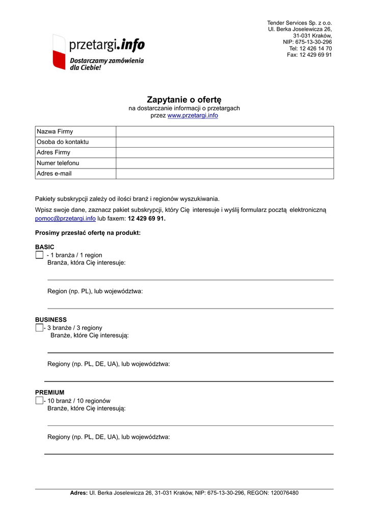 Tender Services Sp. z o.o. Ul. Berka Joselewicza 26, 31-031 Kraków, NIP: 675-13-30-296 Tel: 12 426 14 70 Fax: 12 429 69 91 Zapytanie o ofertę na dostarczanie informacji o przetargach przez www.przetargi.info Nazwa Firmy Osoba do kontaktu Adres Firmy Numer telefonu Adres e-mail Pakiety subskrypcji zależy od ilości branż i regionów wyszukiwania. Wpisz swoje dane, zaznacz pakiet subskrypcji, który Cię interesuje i wyślij formularz pocztą elektroniczną [email protected] lub faxem: 12 429 69 91. Prosimy przesłać ofertę na produkt: BASIC - 1 branża / 1 region Branża, która Cię interesuje: Region (np. PL), lub województwa: BUSINESS - 3 branże / 3 regiony Branże, które Cię interesują: Regiony (np. PL, DE, UA), lub województwa: PREMIUM - 10 branż / 10 regionów Branże, które Cię interesują: Regiony (np. PL, DE, UA), lub województwa: Adres: Ul. Berka Joselewicza 26, 31-031 Kraków, NIP: 675-13-30-296, REGON: 120076480