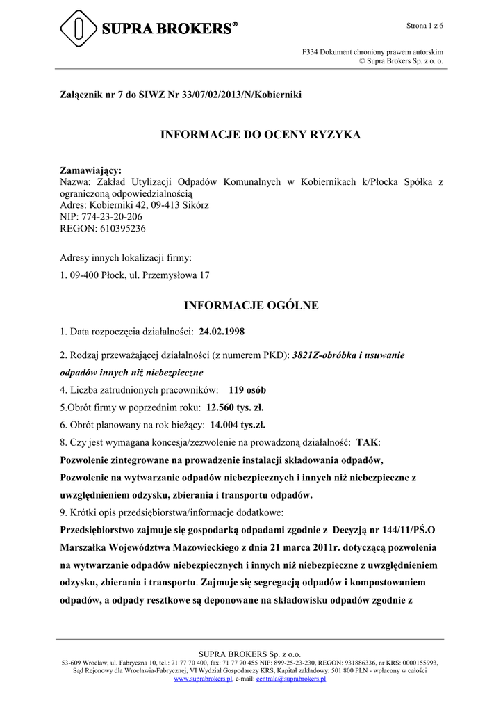 Strona 1 z 6 F334 Dokument chroniony prawem autorskim © Supra Brokers Sp. z o. o. Załącznik nr 7 do SIWZ Nr 33/07/02/2013/N/Kobierniki INFORMACJE DO OCENY RYZYKA Zamawiający: Nazwa: Zakład Utylizacji Odpadów Komunalnych w Kobiernikach k/Płocka Spółka z ograniczoną odpowiedzialnością Adres: Kobierniki 42, 09-413 Sikórz NIP: 774-23-20-206 REGON: 610395236 Adresy innych lokalizacji firmy: 1. 09-400 Płock, ul. Przemysłowa 17 INFORMACJE OGÓLNE 1. Data rozpoczęcia działalności: 24.02.1998 2. Rodzaj przewaŜającej działalności (z numerem PKD): 3821Z-obróbka i usuwanie odpadów innych niŜ niebezpieczne 4. Liczba zatrudnionych pracowników: 119 osób 5.Obrót firmy w poprzednim roku: 12.560 tys. zł. 6. Obrót planowany na rok bieŜący: 14.004 tys.zł. 8. Czy jest wymagana koncesja/zezwolenie na prowadzoną działalność: TAK: Pozwolenie zintegrowane na prowadzenie instalacji składowania odpadów, Pozwolenie na wytwarzanie odpadów niebezpiecznych i innych niŜ niebezpieczne z uwzględnieniem odzysku, zbierania i transportu odpadów. 9. Krótki opis przedsiębiorstwa/informacje dodatkowe: Przedsiębiorstwo zajmuje się gospodarką odpadami zgodnie z Decyzją nr 144/11/PŚ.O Marszałka Województwa Mazowieckiego z dnia 21 marca 2011r. dotyczącą pozwolenia na wytwarzanie odpadów niebezpiecznych i innych niŜ niebezpieczne z uwzględnieniem odzysku, zbierania i transportu. Zajmuje się segregacją odpadów i kompostowaniem odpadów, a odpady resztkowe są deponowane na składowisku odpadów zgodnie z SUPRA BROKERS Sp. z o.o. 53-609 Wrocław, ul. Fabryczna 10, tel.: 71 77 70 400, fax: 71 77 70 455 NIP: 899-25-23-230, REGON: 931886336, nr KRS: 0000155993, Sąd Rejonowy dla Wrocławia-Fabrycznej, VI Wydział Gospodarczy KRS, Kapitał zakładowy: 501 800 PLN - wpłacony w całości www.suprabrokers.pl, e-mail: [email protected] Strona 2 z 6 F334 Dokument chroniony prawem autorskim © Supra Brokers Sp. z o. o. pozwoleniem zintegrowanym wydanym decyzja nr 27/10/PŚ.Z Marszałka Województwa Mazowieckiego z dnia 21.04.2010 r z późniejszymi zmianami 10. Firma wynajmuje pomieszczenia od innych podmiotów 11. Firma nie wynajmuje pomieszczenia innym podmiotom Nr PKD wg klasyfikacji 2007, które mają być objęte ochroną ubezpieczeniową w zakresie odpowiedzialności cywilnej i ryzyk majątkowych: - 38.11-zbieranie odpadów innych niŜ niebezpieczne, - 38.21-obróbka i usuwanie odpadów innych niŜ niebezpieczne, - 38.32-odzysk surowców z materiałów segregowanych. Zakład Utylizacji Odpadów Komunalnych w Kobiernikach k/Płocka Spółka z ograniczoną odpowiedzialnością: 1. nie prowadzi spalarni odpadów, natomiast prowadzi sortownię odpadów; 2. nie dokonuje utylizacji pojazdów samochodowych; 3. nie jest najemcą Ŝadnej nieruchomości. Wynajmuje w zasobach Komunikacji Miejskiej w Płocku 12 pomieszczeń biurowych o łącznej powierzchni 216 m²; 4. nie prowadzi samodzielnie na terenie zakładu prac budowlanych. Prace budowlane są zlecane wyspecjalizowanym firmom, a Zamawiający jako Inwestor Ŝąda od kaŜdego Wykonawcy ubezpieczenia od odpowiedzialności cywilnej w zakresie prowadzonej działalności związanej ze zleconymi pracami budowlanymi. Przewidywane prace budowlane: - rozbudowa i modernizacja budynku na sprzęt i surowce wtórne, - budowa magazynu na odpady, - budowa składowiska odpadów, - budowa instalacji odgazowania składowiska, - modernizacja drogi technologicznej na składowisko. 1. UBEZPIECZENIE MIENIA Firma jest zgłoszona jako podatnik VAT PrzewaŜająca działalność firmy objęta jest podatkiem VAT w stawce: 8 % Mienie firmy ujmowane jest w Rejestrze Środków Trwałych i w innych rejestrach: bez uwzględnienia podatku VAT INFORMACJE TECHNICZNE SUPRA BROKERS Sp. z o.o. 53-609 Wrocław, ul. Fabryczna 10, tel.: 71 77 70 400, fax: 71 77 70 455 NIP: 899-25-23-230, REGON: 931886336, nr KRS: 0000155993, Sąd Rejonowy dla Wrocławia-Fabrycznej, VI Wydział Gospodarczy KRS, Kapitał zakładowy: 501 800 PLN - wpłacony w całości www.suprabrokers.pl, e-mail: [email protected] Strona 3 z 6 F334 Dokument chroniony prawem autorskim © Supra Brokers Sp. z o. o. ANKIETA OCENY OCHRONY PRZECIWPOśAROWEJ ZASTOSOWANE ZABEZPIECZENIA PRZECIWPOśAROWE gaśnice hydranty wewnętrzne hydranty zewnętrzne stały dozór OCENA BUDYNKÓW I BUDOWLI Budynki stoją w zabudowie zwartej Minimalne odległości między budynkami - 20 m ( wentylatornia i biostabilizator ok. 5m Budynki stoją na posesji ogrodzonej Posesja jest oświetlona Konstrukcja budynków: materiały niepalne Budynki nie są wykonane z płyt warstwowych z palnym wypełnieniem np. styropianem lub pianką poliuretanową. Ściany działowe wykonane są z materiałów niepalnych Wystrój wnętrz budynków wykonany jest z materiałów niepalnych Obiekty posiadają wymaganą i sprawną instalację odgromową Istnieją centralne wyłączniki prądu odcinające dopływ energii do wszystkich urządzeń Rodzaj istniejącej instalacji grzewczej: ogrzewanie wodne i ogrzewanie elektryczne OCENA OCHRONY PRZECIWPOśAROWEJ Odległość od najbliŜszej jednostki straŜy poŜarnej + Ochotnicza StraŜ PoŜarna Sikórz, Siecień - 6 km, Zakładowa SP PKN ORLEN S.A.-12 km. Czas dojazdu jednostek straŜy poŜarnej - 20-30 min Istnieje moŜliwość dojazdu jednostek straŜy poŜarnej o kaŜdej porze roku Oznakowane są: drogi poŜarowe, drogi i wyjścia ewakuacyjne, lokalizacje sprzętu ppoŜ. Budynki są wyposaŜone w sprzęt ratowniczo-gaśniczy zgodnie z wymaganiami Istnieje regulamin ppoŜ. SUPRA BROKERS Sp. z o.o. 53-609 Wrocław, ul. Fabryczna 10, tel.: 71 77 70 400, fax: 71 77 70 455 NIP: 899-25-23-230, REGON: 931886336, nr KRS: 0000155993, Sąd Rejonowy dla Wrocławia-Fabrycznej, VI Wydział Gospodarczy KRS, Kapitał zakładowy: 501 800 PLN - wpłacony w całości www.suprabrokers.pl, e-mail: [email protected] Strona 4 z 6 F334 Dokument chroniony prawem autorskim © Supra Brokers Sp. z o. o. Pracownicy przechodzą szkolenie