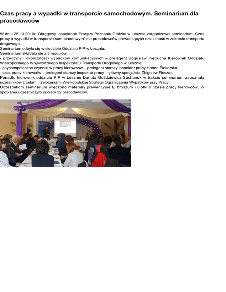 Czas pracy a wypadki w transporcie samochodowym. Seminarium dla pracodawców W dniu 25.10.2010r. Okręgowy Inspektorat Pracy w Poznaniu Oddział w Lesznie zorganizował seminarium „Czas pracy a wypadki w transporcie samochodowym” dla pracodawców prowadzących działalność w zakresie transportu drogowego. Seminarium odbyło się w siedzibie Oddziału PIP w Lesznie. Seminarium składało się z 3 modułów: - przyczyny i okoliczności wypadków komunikacyjnych – prelegent Bogusław Pietrucha Kierownik Oddziału Wielkopolskiego Wojewódzkiego Inspektoratu Transportu Drogowego w Lesznie - psychospołeczne czynniki w pracy kierowców – prelegent starszy inspektor pracy Hanna Piekarska. - czas pracy kierowców – prelegent starszy inspektor pracy – główny specjalista Zbigniew Fleszar. Ponadto kierownik oddziału PIP w Lesznie Danuta Goździewicz-Suchanek w trakcie seminarium zapoznała uczestników z celami i założeniami Wielkopolskiej Strategii Ograniczania Wypadków przy Pracy. Uczestnikom seminarium wręczono materiały prewencyjne tj. broszury i ulotki o czasie pracy kierowców. W spotkaniu uczestniczyło ogółem 32 pracodawców.