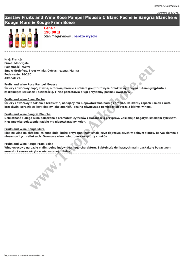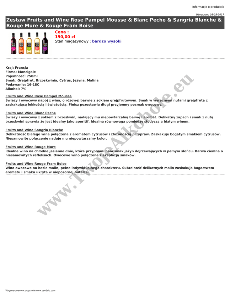 Informacje o produkcie Utworzono 08-03-2017 Zestaw Fruits and Wine Rose Pampel Mousse & Blanc Peche & Sangria Blanche & Rouge Mure & Rouge Fram Boise Cena : 190,00 zł Stan magazynowy : bardzo wysoki ho le . eu Kraj: Francja Firma: Moncigale Pojemność: 750ml Smak: Grejpfrut, Brzoskwinia, Cytrus, Jeżyna, Malina Podawanie: 16-18C Alkohol: 7% Fruits and Wine Rose Pampel Mousse Świeży i owocowy napój z wina, o różowej barwie z sokiem grejpfrutowym. Smak w wyraźnymi nutami grejpfruta z zaskakującą lekkością i świeżością. Finisz pozostawia długi przyjemny posmak owocowy. ko Fruits and Wine Blanc Peche Świeży i owocowy z sokiem z brzoskwiń, nadający mu niepowtarzalną barwę i aromat. Delikatny zapach i smak z nutą brzoskwini sprawia że jest idealny jako aperitif. Idealna równowaga pomiędzy słodyczą a białym winem. Al Fruits and Wine Sangria Blanche Delikatność białego wina połączona z aromatem cytrusów i złożonością przypraw. Zaskakuje bogatym smakiem cytrusów. Niesamowite połączenie nadaje mu niepowtarzalny kolor. oj e Fruits and Wine Rouge Mure Idealne wino na chłodne jesienne dnie, które przypomni nam smak jeżyn dojrzewających w pełnym słońcu. Barwa ciemna o niesamowitych refleksach. Owocowe wino połączone z eksplozją smaków. w w w .T w Fruits and Wine Rouge Fram Boise Wino owocowe na bazie malin, pełne indywidualnego charakteru. Subtelność delikatnych malin zaskakuje bogactwem aromatu i smaku ukryta w niepozornej butelce. Wygenerowano w programie www.oscGold.com