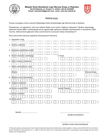 Miejski Klub Strzelecki Ligi Obrony Kraju w Rybniku 44-210 Rybnik, ul. Prosta 11, tel/fax +48 32 4330404 Email: [email protected] www: mks-lok.rybnik.pl Deklaracja. Proszę o przyjęcie mnie w poczet Miejskiego Klubu Strzeleckiego Ligi Obrony Kraju w Rybniku. Oświadczam, że regulamin, cele oraz zadania Klubu są mi znane i będę je realizował. Tytułem wpisowego wpłacam kwotę 300zł i zobowiązuję się do regularnego opłacania składek członkowskich w wysokości 250zł rocznie. Jednocześnie zgłaszam chęć uczestniczenia w pracach sekcji strzeleckiej.(*) Dane personalne (proszę wypełniać drukowanymi literami): 1. Nazwisko i Imię 2. Imiona rodziców 3. Nazwisko panieńskie matki 4. Numer dowodu osobistego 5. Pesel 6. Data i miejsce urodzenia 7. Adres zamieszkania: ulica Miasto Kod pocztowy - 8. Miejsce pracy zawodowej 9. Stopień wojskowy 10.Numer Licencji PZSS Numer Patentu 11.Numer telefonu 12.Adres email Rybnik …………………………….. …………..…………..……………………………… (podpis kandydata ) …………..…………..……………………………… (podpis osoby wprowadzającej) (*) Wyrażam zgodę na przetwarzanie moich danych osobowych dla potrzeb członkostwa w klubie (zgodnie z Ustawą z dnia 29.08.1997 roku o Ochronie Danych Osobowych; tekst jednolity: Dz. U. z 2002r. Nr 101, poz. 926 ze zm.). Przyjmuję do wiadomości, że przysługuje mi prawo wglądu do treści moich danych oraz ich poprawiania.