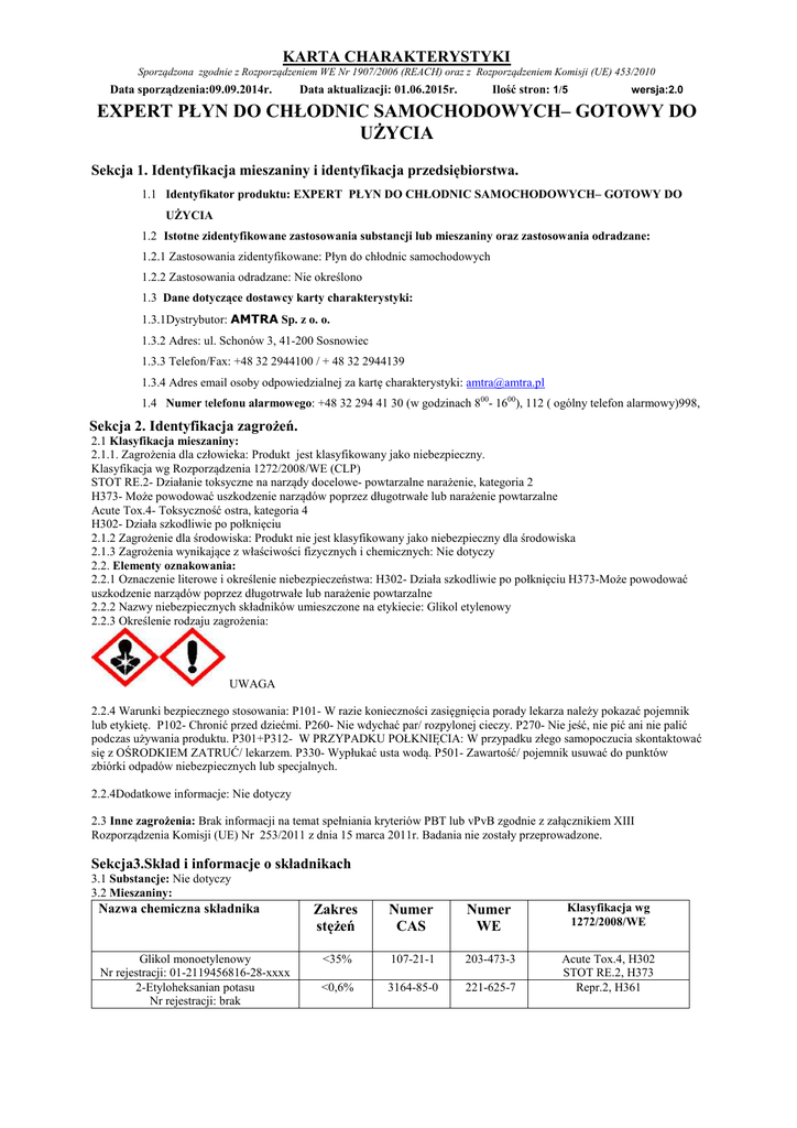 KARTA CHARAKTERYSTYKI Sporządzona zgodnie z Rozporządzeniem WE Nr 1907/2006 (REACH) oraz z Rozporządzeniem Komisji (UE) 453/2010 Data sporządzenia:09.09.2014r. Data aktualizacji: 01.06.2015r. Ilość stron: 1/5 wersja:2.0 EXPERT PŁYN DO CHŁODNIC SAMOCHODOWYCH– GOTOWY DO UŻYCIA Sekcja 1. Identyfikacja mieszaniny i identyfikacja przedsiębiorstwa. 1.1 Identyfikator produktu: EXPERT PŁYN DO CHŁODNIC SAMOCHODOWYCH– GOTOWY DO UŻYCIA 1.2 Istotne zidentyfikowane zastosowania substancji lub mieszaniny oraz zastosowania odradzane: 1.2.1 Zastosowania zidentyfikowane: Płyn do chłodnic samochodowych 1.2.2 Zastosowania odradzane: Nie określono 1.3 Dane dotyczące dostawcy karty charakterystyki: 1.3.1Dystrybutor: AMTRA Sp. z o. o. 1.3.2 Adres: ul. Schonów 3, 41-200 Sosnowiec 1.3.3 Telefon/Fax: +48 32 2944100 / + 48 32 2944139 1.3.4 Adres email osoby odpowiedzialnej za kartę charakterystyki: [email protected] 1.4 Numer telefonu alarmowego: +48 32 294 41 30 (w godzinach 800- 1600), 112 ( ogólny telefon alarmowy)998, Sekcja 2. Identyfikacja zagrożeń. 2.1 Klasyfikacja mieszaniny: 2.1.1. Zagrożenia dla człowieka: Produkt jest klasyfikowany jako niebezpieczny. Klasyfikacja wg Rozporządzenia 1272/2008/WE (CLP) STOT RE.2- Działanie toksyczne na narządy docelowe- powtarzalne narażenie, kategoria 2 H373- Może powodować uszkodzenie narządów poprzez długotrwałe lub narażenie powtarzalne Acute Tox.4- Toksyczność ostra, kategoria 4 H302- Działa szkodliwie po połknięciu 2.1.2 Zagrożenie dla środowiska: Produkt nie jest klasyfikowany jako niebezpieczny dla środowiska 2.1.3 Zagrożenia wynikające z właściwości fizycznych i chemicznych: Nie dotyczy 2.2. Elementy oznakowania: 2.2.1 Oznaczenie literowe i określenie niebezpieczeństwa: H302- Działa szkodliwie po połknięciu H373-Może powodować uszkodzenie narządów poprzez długotrwałe lub narażenie powtarzalne 2.2.2 Nazwy niebezpiecznych składników umieszczone na etykiecie: Glikol etylenowy 2.2.3 Określenie rodzaju zagrożenia: UWAGA 2.2.4 Warunki bezpiecznego stosowania: P101- W razie konieczności zasięgnięcia porady lekarza należy pokazać pojemnik lub etykietę. P102- Chronić przed dziećmi. P260- Nie wdychać par/ rozpylonej cieczy. P270- Nie jeść, nie pić ani nie palić podczas używania produktu. P301+P312- W PRZYPADKU POŁKNIĘCIA: W przypadku złego samopoczucia skontaktować się z OŚRODKIEM ZATRUĆ/ lekarzem. P330- Wypłukać usta wodą. P501- Zawartość/ pojemnik usuwać do punktów zbiórki odpadów niebezpiecznych lub specjalnych. 2.2.4Dodatkowe informacje: Nie dotyczy 2.3 Inne zagrożenia: Brak informacji na temat spełniania kryteriów PBT lub vPvB zgodnie z załącznikiem XIII Rozporządzenia Komisji (UE) Nr 253/2011 z dnia 15 marca 2011r. Badania nie zostały przeprowadzone. Sekcja3.Skład i informacje o składnikach 3.1 Substancje: Nie dotyczy 3.2 Mieszaniny: Nazwa chemiczna składnika Glikol monoetylenowy Nr rejestracji: 01-2119456816-28-xxxx 2-Etyloheksanian potasu Nr rejestracji: brak Zakres stężeń Numer CAS Numer WE Klasyfikacja wg 1272/2008/WE <35% 107-21-1 203-473-3 <0,6% 3164-85-0 221-625-7 Acute Tox.4, H302 STOT RE.2, H373 Repr.2, H361 KARTA CHARAKTERYSTYKI Sporządzona zgodnie z Rozporządzeniem WE Nr 1907/2006 (REACH) oraz z Rozporządzeniem Komisji (UE) 453/2010 Data sporządzenia:09.09.2014r. Data aktualizacji: 01.06.2015r. Ilość stron: 2/5 wersja:2.0 EXPERT PŁYN DO CHŁODNIC SAMOCHODOWYCH– GOTOWY DO UŻYCIA SEKCJA 4. ŚRODKI PIERWSZEJ POMOCY 4.1 Opis środków pierwszej pomocy: 4.1.1 Połknięcie: Nie wywoływać wymiotów. Wypłukać usta wodą. Nigdy nie podawać niczego do ust osobie nieprzytomnej. Wezwać lekarza, pokazać opakowanie lub etykietę. 4.1.2. Zatrucie inhalacyjne: Skonsultować się z lekarzem, w razie wystąpienia niepokojących dolegliwości. Wyprowadzić poszkodowanego na świeże powietrze, zapewnić ciepło i spokój. 4.1.3. Skażenie skóry: Zdjąć skażoną odzież. Narażone partie skóry zmyć dokładnie wodą z mydłem. Skonsultować się z lekarzem w przypadku wystąpienia niepokojących objawów. 4.1.4.Skażenie oczu: Chronić niepodrażnione oko, wyjąć szkła kontaktowe. Zanieczyszczone oczy przepłukać dokładnie wodą przez kilka minut. Unikać silnego strumienia wody – ryzyko uszkodzenia rogówki. Skonsultować się z lekarzem okulistą w przypadku wystąpienia niepokojących objawów. 4.2 Najważniejsze ostre i opóźnione objawy oraz skutki narażenia: 4.2.1 Skażenie oczu: Może wystąpić podrażnienie, zaczerwienienie oraz łzawienie 4.2.2 Połknięcie: Mogą pojawić się mdłości, wymioty, ból głowy, zaburzenia równowagi i koordynacji, senność 4.4.3 Skóra: Może wystąpić zaczerwienienie, wysuszenie i pękanie skóry 4.3 Wskazania dotyczące wszelkiej natychmiastowej pomocy lekarskiej i szczególnego postępowania z poszkodowanym: Podjąć leczenie objawowe. Decyzję o sposobie postępowanie ratunkowego podejmuje lekarz po dokładnej ocenie stanu poszkodowanego. SEKCJA 5. POSTĘPOWANIE W PRZYPADKU POŻARU 5.1 Środki gaśnicze: 5.1.1 Odpowiednie środki gaśnicze: Stosować proszek gaśniczy, CO2, woda-prądy rozproszone, pianę odporną na alkohol 5.1.2 Niewłaściwe środki gaśnicze: Woda- zwarty strumień wody 5.2 Szczególne zagrożenia związane z mieszaniną: Podczas spalania mogą tworzyć się toksyczne spaliny zawierające tlenki węgla. Unikać wdychania produktów spalania, mogą stwarzać zagrożenie dla zdrowia. 5.3 Informacje dla straży pożarnej: Stosować standardowe metody gaszenia pożarów chemicznych. Zbiorniki narażone na działanie wysokiej temperatury chłodzić wodą i w miarę możliwości usunąć z zagrożonego obszaru. Opary alkoholu strącić rozproszonymi strumieniami wody. Strażaków wyposażyć w ubrania odporne na działanie wysokich temperatur. Niezależne aparaty izolujące drogi oddechowe. Stosować eksplozymetr. SEKCJA 6. POSTĘPOWANIE W PRZYPADKU NIEZAMIERZONEGO UWOLIENIA