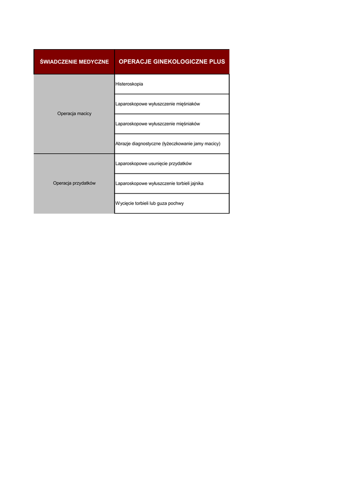ŚWIADCZENIE MEDYCZNE OPERACJE GINEKOLOGICZNE PLUS Histeroskopia Laparoskopowe wyłuszczenie mięśniaków Operacja macicy Laparoskopowe wyłuszczenie mięśniaków Abrazje diagnostyczne (łyżeczkowanie jamy macicy) Laparoskopowe usunięcie przydatków Operacja przydatków Laparoskopowe wyłuszczenie torbieli jajnika Wycięcie torbieli lub guza pochwy