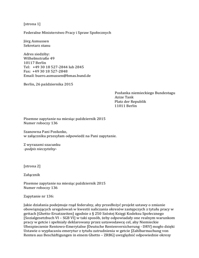 [strona 1] Federalne Ministerstwo Pracy i Spraw Społecznych Jörg Asmussen Sekretarz stanu Adres siedziby: Wilhelmstraße 49 10117 Berlin Tel: +49 30 18 527-2844 lub 2845 Fax: +49 30 18 527-2848 Email: [email protected] Berlin, 26 października 2015 Posłanka niemieckiego Bundestagu Azize Tank Platz der Republik 11011 Berlin Pisemne zapytanie na miesiąc październik 2015 Numer roboczy 136 Szanowna Pani Posłanko, w załączniku przesyłam odpowiedź na Pani zapytanie. Z wyrazami szacunku -podpis nieczytelny- [strona 2] Załącznik Pisemne zapytanie na miesiąc październik 2015 Numer roboczy 136 Zapytanie nr 136: Jakie działania podejmuje rząd federalny, aby przedłożyć projekt ustawy o zmianie obowiązujących uregulowań w kwestii naliczania okresów zastępczych z tytułu pracy w gettach [Ghetto-Ersatzzeiten] zgodnie z § 250 Szóstej Księgi Kodeksu Społecznego [Sozialgesetzbuch VI – SGB VI] w taki sposób, żeby odpowiadały one realnym warunkom pracy w getcie i spełniały deklarowany przez ustawodawcę cel, aby Niemieckie Ubezpieczenie Rentowo-Emerytalne [Deutsche Rentenversicherung - DRV] mogło dzięki Ustawie o wypłacaniu emerytur z tytułu zatrudnienia w getcie [Zahlbarmachung von Renten aus Beschäftigungen in einem Ghetto – ZRBG] uwzględnić odpowiednie okresy zatrudnienia w getcie? Według posiadanych przeze mnie informacji pełnomocnika Zarządu Związku Gmin Wyznaniowych Żydowskich w Rzeczypospolitej Polskiej (ZGWŻ) oraz Stowarzyszenia Romów w Polsce obecne zastosowanie § 250 SGB VI w wielu wypadkach prowadzi do dyskryminacji przy wypłacaniu emerytur gettowych lub skutkuje odmową prawa do jej otrzymywania. Dotyczy to zwłaszcza matek, wobec których okresy opieki nad dzieckiem [Kindererziehungszeiten] nie są uznawane jako okresy zastępcze do emerytury, w przypadku gdy ze względu na sprawowanie opieki nad dziećmi nie osiągnęły one minimalnego okresu ubezpieczenia [Wartezeit], a także osób, którym odmawia się prawa do emerytury gettowej z powodu nie zaliczenia okresów zastępczych związanych z prześladowaniami w rozumieniu § 250 SGB VI, w przypadku gdy osoby te nie miały wówczas ukończonego 14 roku życia. Osobom tym odmawia się prawa do emerytury gettowej pomimo dokonanego uprzednio uznania przez DRV okresów składkowych z tytułu samego zatrudnienia w getcie oraz pomimo faktu, że ówczesne niemieckie urzędy pracy systematycznie zatrudniały w gettach osoby niepełnoletnie także w przypadkach, gdy osoby te nie ukończyły 14 roku życia. Odpowiedź: W prawie ustawowego ubezpieczenia rentowo – emerytalnego istnieje możliwość uwzględnienia okresów czasu, w których ze względu na wyjątkowe okoliczności uniemożliwiono osobom ubezpieczonym opłacenie składek emerytalnych oraz zaliczenie tych okresów na ściśle określonych warunkach jako tzw. okresów zastępczych [Ersatzzeit] (§ 250, SGB VI). Dzięki uwzględnieniu okresów zastępczych domniemuje się istnienie zatrudnienia podlegające obowiązkowemu ubezpieczeniu, a tym samym domniemuje się opłacenie składek. Okresy zastępcze mogą być przy tym zaliczone dopiero od ukończenia 14 roku życia, gdyż w zwykłych okolicznościach nie można zakładać, iż przed osiągnięciem tego wieku uiszczono składki na ustawowe ubezpieczenie rentowo – emerytalne. Regulacji tej nie podważa fakt, że w pojedynczych przypadkach składki uiszczane były istotnie już przed ukończeniem 14 roku życia. Dokonanie zmian w obecnej ustawowej regulacji w stosunku do okresów zastępczych nie jest planowane.