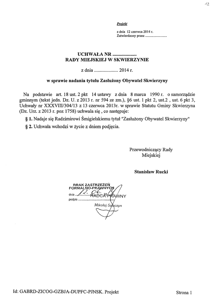 § 1. Nadaje się Radzimirowi Śmigielskiemu tytuł "Zasłużony Obywatel Skwierzyny"