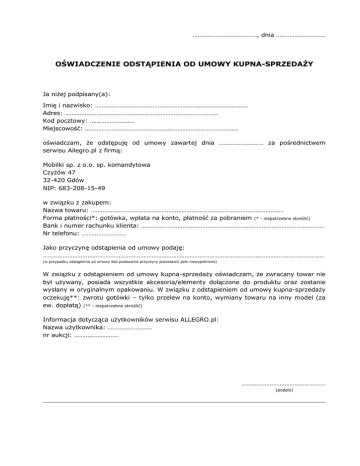 …………………………………, dnia ………………………… OŚWIADCZENIE ODSTĄPIENIA OD UMOWY KUPNA-SPRZEDAŻY Ja niżej podpisany(a): Imię i nazwisko: ………………………………………………………………………………… Adres: ………………………………………………………………………………… Kod pocztowy: ……………………… Miejscowość: ………………………………………………………………………………… oświadczam, że odstępuję od umowy zawartej dnia ……………………… za pośrednictwem serwisu Allegro.pl z firmą: Mobilki sp. z o.o. sp. komandytowa Czyżów 47 32-420 Gdów NIP: 683-208-15-49 w związku z zakupem: Nazwa towaru: ……………………………………………………………………………………………………… Forma płatności*: gotówka, wpłata na konto, płatność za pobraniem (* - niepotrzebne skreślić) Bank i numer rachunku klienta: ………………………………………………………………………………………………… Nr telefonu: ……………………… Jako przyczynę odstąpienia od umowy podaję: ……………………………………………………………………………………………………………………………………………………… (w przypadku odstąpienia od umowy bez podawania przyczyny pozostawić pole niewypełnione) W związku z odstąpieniem od umowy kupna-sprzedaży oświadczam, że zwracany towar nie był używany, posiada wszystkie akcesoria/elementy dołączone do produktu oraz zostanie wysłany w oryginalnym opakowaniu. W związku z odstąpieniem od umowy kupna-sprzedaży oczekuję**: zwrotu gotówki – tylko przelew na konto, wymiany towaru na inny model (za ew. dopłatą) (** - niepotrzebne skreślić) Informacja dotycząca użytkowników serwisu ALLEGRO.pl: Nazwa użytkownika: ……………………… nr aukcji: ……………………… …………………………………………… (podpis)