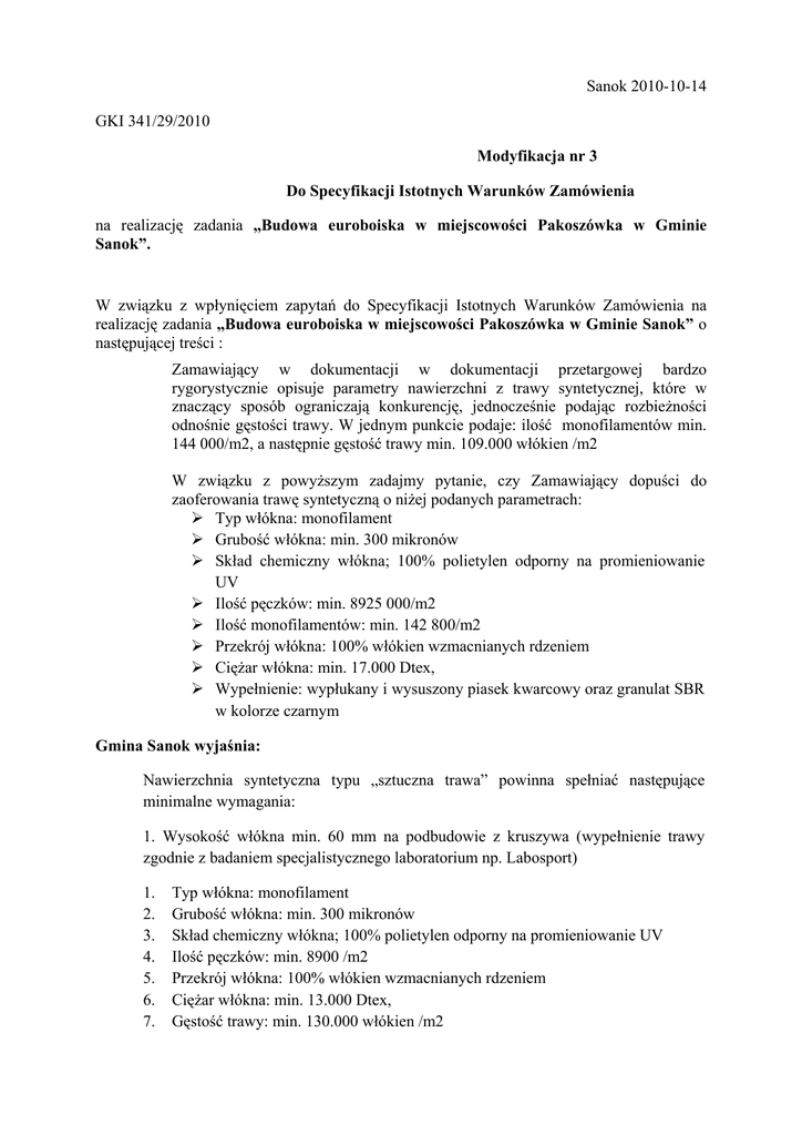 Sanok 2010-10-14 GKI 341/29/2010 Modyfikacja nr 3 Do Specyfikacji Istotnych Warunków Zamówienia na realizację zadania „Budowa euroboiska w miejscowości Pakoszówka w Gminie Sanok”. W związku z wpłynięciem zapytań do Specyfikacji Istotnych Warunków Zamówienia na realizację zadania „Budowa euroboiska w miejscowości Pakoszówka w Gminie Sanok” o następującej treści : Zamawiający w dokumentacji w dokumentacji przetargowej bardzo rygorystycznie opisuje parametry nawierzchni z trawy syntetycznej, które w znaczący sposób ograniczają konkurencję, jednocześnie podając rozbieŜności odnośnie gęstości trawy. W jednym punkcie podaje: ilość monofilamentów min. 144 000/m2, a następnie gęstość trawy min. 109.000 włókien /m2 W związku z powyŜszym zadajmy pytanie, czy Zamawiający dopuści do zaoferowania trawę syntetyczną o niŜej podanych parametrach: Typ włókna: monofilament Grubość włókna: min. 300 mikronów Skład chemiczny włókna; 100% polietylen odporny na promieniowanie UV Ilość pęczków: min. 8925 000/m2 Ilość monofilamentów: min. 142 800/m2 Przekrój włókna: 100% włókien wzmacnianych rdzeniem CięŜar włókna: min. 17.000 Dtex, Wypełnienie: wypłukany i wysuszony piasek kwarcowy oraz granulat SBR w kolorze czarnym Gmina Sanok wyjaśnia: Nawierzchnia syntetyczna typu „sztuczna trawa” powinna spełniać następujące minimalne wymagania: 1. Wysokość włókna min. 60 mm na podbudowie z kruszywa (wypełnienie trawy zgodnie z badaniem specjalistycznego laboratorium np. Labosport) 1. 2. 3. 4. 5. 6. 7. Typ włókna: monofilament Grubość włókna: min. 300 mikronów Skład chemiczny włókna; 100% polietylen odporny na promieniowanie UV Ilość pęczków: min. 8900 /m2 Przekrój włókna: 100% włókien wzmacnianych rdzeniem CięŜar włókna: min. 13.000 Dtex, Gęstość trawy: min. 130.000 włókien /m2 8. 9. Wypełnienie: wypłukany i wysuszony piasek kwarcowy oraz granulat SBR w kolorze czarnym Gwarancja- 60 miesięcy Dokumenty dotyczące systemu nawierzchni z trawy syntetycznej, które naleŜy dołączyć do oferty: 1. Raport z badań przeprowadzonych przez laboratorium (Labosport lub ISA-Sport lub Sports Labs Ltd), dotyczący oferowanej nawierzchni, potwierdzający zgodność jej parametrów z FIFA Quality Concept for Football Turf (dostępny na www.FIFA.com). Raport powinien potwierdzać spełnienie parametrów dla uzyskania certyfikatu FIFA 2 stars dla systemu nawierzchni (umoŜliwiających uzyskanie przez obiekt certyfikatu FIFA !!!) 2. Certyfikat lub deklaracja zgodności z normą PN-EN 15330-1:2008, lub aprobata techniczna ITB, lub rekomendacja techniczna ITB. 3. Karta techniczna oferowanej nawierzchni, potwierdzona przez jej producenta. 4. Atest PZH lub równowaŜny dla oferowanej nawierzchni i wypełnienia. 5. Autoryzacja producenta trawy syntetycznej, wystawiona dla wykonawcy na realizowaną inwestycję wraz z potwierdzeniem gwarancji udzielonej przez producenta na tę nawierzchnię. 6. Zamawiający wymaga dodatkowo gwarancji na granulat potwierdzonej przez dostawcę sztucznej trawy.
