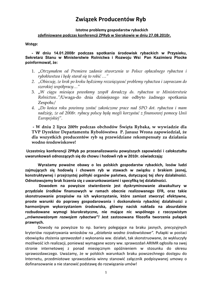 Związek Producentów Ryb Istotne problemy gospodarstw rybackich zdefiniowane podczas konferencji ZPRyb w Sierakowie w dniu 27.08.2010r. Wstęp: - W dniu 14.01.2008r podczas spotkania środowisk rybackich w Przysieku, Sekretarz Stanu w Ministerstwie Rolnictwa i Rozwoju Wsi Pan Kazimierz Plocke poinformował, że: 1. „Otrzymałem od Premiera zadanie stworzenia w Polsce opłacalnego rybactwa i rybołówstwa i będę starał się to robić …” 2. „Obiecuję, że krok po kroku będziemy rozwiązywać problemy rybactwa i zapraszam do szerokiej współpracy…” 3. „W ciągu miesiąca powołamy zespół doradczy ds. rybactwa w Ministerstwie Rolnictwa..”/Uwaga-do dnia dzisiejszego nie odbyto żadnego spotkania Zespołu/ 4. „Do końca roku powinny zostać zakończone prace nad SPO dot. rybactwa i mam nadzieję, że od 2008r. rybacy polscy będą mogli korzystać z finansowej pomocy Unii Europejskiej”. - W dniu 2 lipca 2009r podczas obchodów Święta Rybaka, w wywiadzie dla TVP Dyrektor Departamentu Rybołówstwa P. Janusz Wrona zapowiedział, że dla wszystkich producentów ryb są przewidziane rekompensaty za działania wodno środowiskowe! Uczestnicy konferencji ZPRyb po przeanalizowaniu powyższych zapowiedzi i całokształtu uwarunkowań odnoszących się do chowu i hodowli ryb w 2010r. oświadczają: Wyrażamy poważne obawy o los polskich gospodarstw rybackich, losów ludzi zajmujących się hodowlą i chowem ryb w stawach w związku z brakiem jasnej, konstruktywnej i przejrzystej polityki organów państwa, dotyczącej tej sfery działalności. Odnotowujemy brak liczenia się z uwarunkowaniami i specyfiką tej działalności. Dowodem na powyższe stwierdzenie jest dyskryminowanie akwakultury w przydziale środków finansowych w ramach obecnie realizowanego EFR, oraz takie skonstruowanie przepisów na ich wykorzystanie, które zamiast stworzyć efektywne, proste warunki do poprawy gospodarowania i doskonalenia rybackiej działalności z harmonijnym wykorzystaniem środowiska, główny nacisk nakłada na absurdalnie rozbudowane wymogi biurokratyczne, nie mające nic wspólnego z rzeczywistym „zrównoważonym rozwojem rybactwa”! Jest zastosowana filozofia tworzenia pułapek prawnych. Dowody na powyższe to np. bariery polegające na braku jasnych, precyzyjnych kryteriów rozpatrywania wniosków na „działania wodno środowiskowe”. Pułapki w postaci obowiązku złożenia sprawozdań z wykonania ww. działań, tak skonstruowane, że wykluczyły możliwość ich realizacji, ponieważ wymagane wzory ww. sprawozdań ARIMR ogłosiła na swej stronie internetowej z ponad miesięcznym opóźnieniem w stosunku do okresu sprawozdawczego. Uważamy, że w polskich warunkach braku powszechnego dostępu do Internetu, przedmiotowe sprawozdania winny stanowić załącznik podpisywanej umowy o dofinansowanie a nie stanowić podstawę do rozwiązania umów! 1 Wnioskujemy o stosowanie do rybactwa miary jak do rolnictwa w dysponowaniu i realizowaniu funduszy przeznaczonych na rozwój rybactwa, a nie tworzenie warunków do poniżającego nas realizowania wymysłów biurokracji, stawiania nas w dwuznacznej sytuacji i niczym nie usprawiedliwionego insynuowania „działań w szarej strefie”! Uważamy, że środki finansowe EFR mają służyć zrównoważonemu rozwojowi rybactwa a nie powodować zaburzenia warunków równej konkurencji w chowie i hodowli ryb! Główne istotne problemy gospodarstw rybackich: 1. Jako najważniejszy problem zdefiniowano błędy, popełnione podczas planowania i wprowadzania środków finansowych z EFR w ramach programu 2007-2013 dyskryminujące akwakulturę! Uzasadnienie powyższego zawarte jest w załącznikach nr 1,2,3. 2. Konieczność nowelizacji ustawy o rybactwie śródlądowym: a/. wzmocnienie prawnego znaczenia obrębów hodowlanych w tym m. in. - zakaz wstępu na obręb hodowlany w godzinach nocnych, - określenie prawnych zasad wyłączających połowy ryb w ciekach przepływających pomiędzy stawami rybnymi w Obrębach Hodowlanych wchodzących w skład obwodów rybackich. b/. wprowadzenie obowiązku ewidencjonowania handlu sieciami rybackimi i sprzedaży ich tylko podmiotom „uprawnionym do rybactwa”. c/. prawne sprecyzowanie zasad zwalczania szkodników rybackich w taki sposób, by zapewnić ochronę rybostanu i urządzeń hydrotechnicznych na stawach, szczególnie uwzględniając fakt, że są one sztucznie zbudowane dla chowu ryb. Dla spełnienia powyższego należy m. in. - w ustawie o ochronie przyrody usunąć w art.52 ust.3 – dodany ustęp wprowadza całkowity zakaz uśmiercania ptaków-kormoranów wprowadzając ostrzejsze działania ochronne niż te, które przewidziano w dyrektywach unijnych. 3. Postuluje się o stworzenie ustawowych możliwości przedłużania pozwoleń wodno prawnych udzielonych na pobór i zrzut wód ze stawów rybnych. Obecne uregulowania prawne - Ustawa prawo wodne, nie przewidują takiej możliwości! 4. Utworzenie Funduszu Gospodarki Rybackiej /FGR/ przeznaczając na ten cel m.in. część podatków od stawów /grunty Wsr/, czynszu od użytkowania rybackiego jezior, czynszu za dzierżawę stawów z ANR. 5. W ODR-ach zorganizować doradztwo fachowe dla rybaków lub przekazać środki finansowe na zorganizowanie doradztwa rybackiego w ramach działalności ZPRyb. 6. Egzekwować realizacje planów odstrzału łysek i kaczek na stawach przez Koła Łowieckie a w przypadkach braku realizacji powyższego, należy wypracować tok postępowania w celu dokonywanie przez PZŁ wypłat rekompensat za wyjadane zboże przez łyski i kaczki. Alternatywnym rozwiązaniem ustawowym w przypadku nie stworzenia możliwości ograniczania „szkodników rybackich” przez rybaków, powinno być utworzenie funduszu z 2 którego wypłacane byłyby odszkodowania za wyrządzane szkody. Nie może przecież być tak, że jedynymi, którzy finansują bardzo nieracjonalną opiekę nad np. kormoranami są rybacy! 7. Wnioskuje się o szybki
