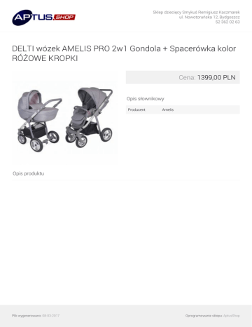 Sklep dziecięcy Smykuś Remigiusz Kaczmarek ul. Nowotoruńska 12, Bydgoszcz 52 362 02 63 DELTI wózek AMELIS PRO 2w1 Gondola + Spacerówka kolor RÓŻOWE KROPKI Cena: 1399,00 PLN Opis słownikowy Producent Amelis Opis produktu Plik wygenerowano: 08-03-2017 Powered by TCPDF (www.tcpdf.org) Oprogramowanie sklepu: AptusShop
