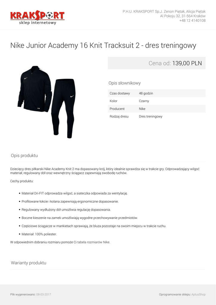 P.H.U. KRAKSPORT Sp.J. Zenon Piętak, Alicja Piętak Al.Pokoju 32, 31-564 Kraków +48 12 4140108 Nike Junior Academy 16 Knit Tracksuit 2 - dres treningowy Cena od: 139,00 PLN Opis słownikowy Czas dostawy 48 godzin Kolor Czarny Producent Nike Rodzaj dresu Dres treningowy Opis produktu Dziecięcy dres piłkarski Nike Academy Knit 2 ma dopasowany krój, który idealnie sprawdza się w trakcie gry. Odprowadzający wilgoć materiał, regulowany dół oraz wewnętrzny ściągacz zapewniają swobodę ruchów. Cechy produktu: Materiał Dri-FIT odprowadza wilgoć, a siateczka odpowiada za wentylację. Profilowane łokcie i kolana zapewniają ergonomiczne dopasowanie. Regulowany wydłużony dół umożliwia regulację dopasowania. Boczne kieszenie na zamek umożliwiają wygodne przechowywanie przedmiotów. Częściowe ściągacze w mankietach sprawiają, że bluza pozostaje na swoim miejscu w trakcie ruchu. Materiał: 100% poliester. W odpowiednim dobraniu rozmiaru pomoże Ci tabela rozmiarów Nike. Warianty produktu Plik wygenerowano: 08-03-2017 Oprogramowanie sklepu: AptusShop P.H.U. KRAKSPORT Sp.J. Zenon Piętak, Alicja Piętak Al.Pokoju 32, 31-564 Kraków +48 12 4140108 XS 139,00 PLN S 139,00 PLN M 139,00 PLN L 139,00 PLN XL 139,00 PLN Galeria Plik wygenerowano: 08-03-2017 Powered by TCPDF (www.tcpdf.org) Oprogramowanie sklepu: AptusShop
