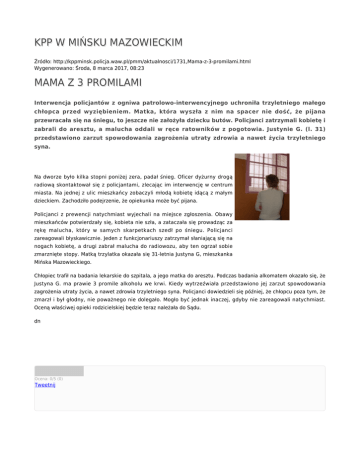 KPP W MIŃSKU MAZOWIECKIM Źródło: http://kppminsk.policja.waw.pl/pmm/aktualnosci/1731,Mama-z-3-promilami.html Wygenerowano: Środa, 8 marca 2017, 08:23 MAMA Z 3 PROMILAMI Interwencja policjantów z ogniwa patrolowo-interwencyjnego uchroniła trzyletniego małego chłopca przed wyziębieniem. Matka, która wyszła z nim na spacer nie dość, że pijana przewracała się na śniegu, to jeszcze nie założyła dziecku butów. Policjanci zatrzymali kobietę i zabrali do aresztu, a malucha oddali w ręce ratowników z pogotowia. Justynie G. (l. 31) przedstawiono zarzut spowodowania zagrożenia utraty zdrowia a nawet życia trzyletniego syna. Na dworze było kilka stopni poniżej zera, padał śnieg. Oficer dyżurny drogą radiową skontaktował się z policjantami, zlecając im interwencję w centrum miasta. Na jednej z ulic mieszkańcy zobaczyli młodą kobietę idącą z małym dzieckiem. Zachodziło podejrzenie, że opiekunka może być pijana. Policjanci z prewencji natychmiast wyjechali na miejsce zgłoszenia. Obawy mieszkańców potwierdzały się, kobieta nie szła, a zataczała się prowadząc za rękę malucha, który w samych skarpetkach szedł po śniegu. Policjanci zareagowali błyskawicznie. Jeden z funkcjonariuszy zatrzymał słaniającą się na nogach kobietę, a drugi zabrał malucha do radiowozu, aby ten ogrzał sobie zmarznięte stopy. Matką trzylatka okazała się 31-letnia Justyna G, mieszkanka Mińska Mazowieckiego. Chłopiec trafił na badania lekarskie do szpitala, a jego matka do aresztu. Podczas badania alkomatem okazało się, że Justyna G. ma prawie 3 promile alkoholu we krwi. Kiedy wytrzeźwiała przedstawiono jej zarzut spowodowania zagrożenia utraty życia, a nawet zdrowia trzyletniego syna. Policjanci dowiedzieli się później, że chłopcu poza tym, że zmarzł i był głodny, nie poważnego nie dolegało. Mogło być jednak inaczej, gdyby nie zareagowali natychmiast. Oceną właściwej opieki rodzicielskiej będzie teraz należała do Sądu. dn Ocena: 0/5 (0) Tweetnij