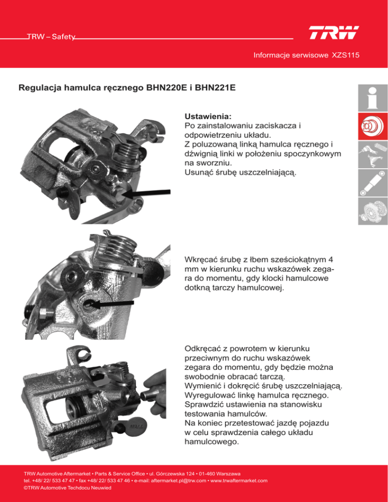 Informacje serwisowe XZS115 Regulacja hamulca ręcznego BHN220E i BHN221E Ustawienia: Po zainstalowaniu zaciskacza i odpowietrzeniu układu. Z poluzowaną linką hamulca ręcznego i dźwignią linki w położeniu spoczynkowym na sworzniu. Usunąć śrubę uszczelniającą. Wkręcać śrubę z łbem sześciokątnym 4 mm w kierunku ruchu wskazówek zegara do momentu, gdy klocki hamulcowe dotkną tarczy hamulcowej. Odkręcać z powrotem w kierunku przeciwnym do ruchu wskazówek zegara do momentu, gdy będzie można swobodnie obracać tarczą. Wymienić i dokręcić śrubę uszczelniającą. Wyregulować linkę hamulca ręcznego. Sprawdzić ustawienia na stanowisku testowania hamulców. Na koniec przetestować jazdę pojazdu w celu sprawdzenia całego układu hamulcowego. TRW Automotive Aftermarket • Parts & Service Office • ul. Górczewska 124 • 01-460 Warszawa tel. +48/ 22/ 533 47 47 • fax +48/ 22/ 533 47 46 • e-mail: [email protected] • www.trwaftermarket.com ©TRW Automotive Techdocu Neuwied