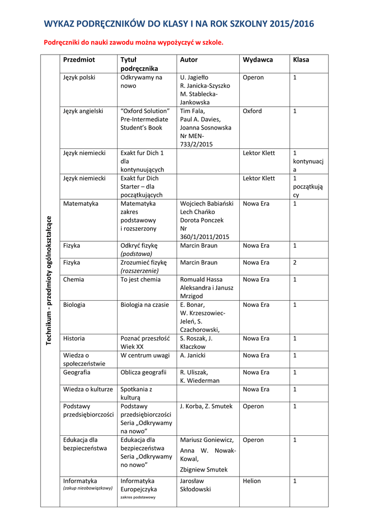 WYKAZ PODRĘCZNIKÓW DO KLASY I NA ROK SZKOLNY 2015/2016 Podręczniki do nauki zawodu można wypożyczyć w szkole. Przedmiot Tytuł podręcznika Autor Wydawca Klasa Język polski Odkrywamy na nowo Operon 1 Język angielski “Oxford Solution” Pre-Intermediate Student’s Book U. Jagiełło R. Janicka-Szyszko M. StableckaJankowska Tim Fala, Paul A. Davies, Joanna Sosnowska Nr MEN733/2/2015 Oxford 1 Język niemiecki Exakt fur Dich 1 dla kontynuujących Exakt fur Dich Starter – dla początkujących Matematyka zakres podstawowy i rozszerzony Lektor Klett Język niemiecki Technikum - przedmioty ogólnokształcące Matematyka Fizyka Chemia Odkryd fizykę (podstawa) Zrozumied fizykę (rozszerzenie) To jest chemia Biologia Biologia na czasie Historia Poznad przeszłośd Wiek XX W centrum uwagi Fizyka Wiedza o społeczeostwie Geografia Oblicza geografii Spotkania z kulturą Podstawy Podstawy przedsiębiorczości przedsiębiorczości Seria „Odkrywamy na nowo” Edukacja dla Edukacja dla bezpieczeostwa bezpieczeostwa Seria „Odkrywamy no nowo” Wojciech Babiaoski Lech Chaoko Dorota Ponczek Nr 360/1/2011/2015 Marcin Braun Nowa Era 1 kontynuacj a 1 początkują cy 1 Nowa Era 1 Marcin Braun Nowa Era 2 Romuald Hassa Aleksandra i Janusz Mrzigod E. Bonar, W. KrzeszowiecJeleo, S. Czachorowski, S. Roszak, J. Kłaczkow A. Janicki Nowa Era 1 Nowa Era 1 Nowa Era 1 Nowa Era 1 R. Uliszak, K. Wiederman Nowa Era 1 Nowa Era 1 J. Korba, Z. Smutek Operon 1 Mariusz Goniewicz, Operon 1 Helion 1 Lektor Klett Wiedza o kulturze Informatyka (zakup nieobowiązkowy) Informatyka Europejczyka zakres podstawowy Anna W. NowakKowal, Zbigniew Smutek Jarosław Skłodowski Religia Technik informatyk Montaż i eksploatacja komputerów Sieci komputerowe i urządzenia sieciowe Technik geodeta Geodezja ogólna Technik elektryk Maszyny i urządzenia elektryczne Pracownia elektryczna i elektroniczna Technik budownictwa Budownictwo ogólne Dokumentacja budowlana Świadek Chrystusa w Kościele Jan Szpet, Danuta Jackowiak Wydawnictwo Św. Wojciecha 1 Świadek Chrystusa w świecie 2 Świadectwo miłości społecznej 3 Świadek Chrystusa w rodzinie 4 Montaż i eksploatacja komputerów osobistych oraz urządzeo peryferyjnych Projektowanie lokalnych sieci komputerowych i administrowanie sieciami Częśd 1 Tomasz Kowalski, Helion 1 B. Halska, Paweł Bensen Helion 2 Geodezja I A. Jagielski Stabil Kraków 1 Maszyny elektryczne E. Goźlioska WSiP 1 Pracownia elektryczna M. Pilawski WSiP 1 Budownictwo ogólne Konstrukcje budowlane Rysunek techniczny budowlany Bezpieczeostwo i higiena pracy Mirosława Popek, Bożenna Wapioska Grażyna Janik WSiP 1 WSiP 1 Tadeusz Maj WSiP 1 Krzysztof Szczęch, Wanda Bukała WSiP 1 Podręczniki do nauki zawodu można wypożyczyć w szkole.