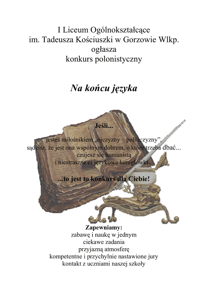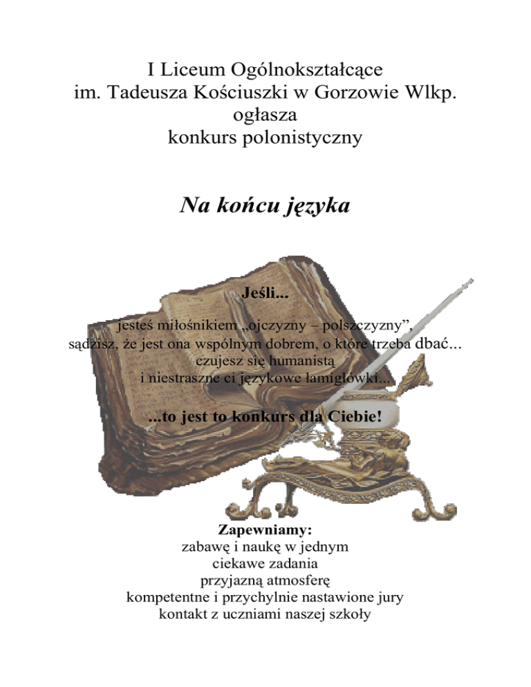 I Liceum Ogólnokształcące im. Tadeusza Kościuszki w Gorzowie Wlkp. ogłasza konkurs polonistyczny Na końcu języka Jeśli... jesteś miłośnikiem „ojczyzny – polszczyzny”, sądzisz, że jest ona wspólnym dobrem, o które trzeba dbać... czujesz się humanistą i niestraszne ci językowe łamigłówki... ...to jest to konkurs dla Ciebie! Zapewniamy: zabawę i naukę w jednym ciekawe zadania przyjazną atmosferę kompetentne i przychylnie nastawione jury kontakt z uczniami naszej szkoły REGULAMIN KONKURSU POLONISTYCZNEGO Na końcu języka §1 Organizatorem konkursu jest I Liceum Ogólnokształcące im. Tadeusza Kościuszki w Gorzowie Wielkopolskim (adres: ul. Puszkina 31 Gorzów Wlkp., tel. 957204964, 667 659 341, www.zso1.edu.gorzow.pl). §2 Adresaci konkursu 1. Uczestnikami konkursu mogą być uczniowie gimnazjów miasta Gorzowa i powiatu gorzowskiego, strzelecko-drezdeneckiego, sulęcińskiego, myśliborskiego, międzyrzeckiego i barlineckiego. 2. Zainteresowanych uczniów zgłasza nauczyciel – opiekun wg wzoru zgłoszenia – załącznik nr 1. 3. W konkursie mogą brać udział uczniowie wszystkich klas gimnazjalnych. §3 Cele konkursu obejmują: popularyzację języka polskiego jako części polskiego dziedzictwa kulturowego rozwijanie postawy dbałości o piękno i poprawność języka polskiego rozwijanie zainteresowań i umiejętności polonistycznych wspomaganie przygotowania uczniów do egzaminu gimnazjalnego z języka polskiego tworzenie warunków sprzyjających udziałowi młodzieży w przedsięwzięciach naukowych uaktywnienie nauczycieli w pracy z polonistycznie uzdolnionymi uczniami §4 Założenia organizacyjne 1. Konkurs odbywa się w I Liceum Ogólnokształcącym 21 lutego 2014 r. o godz. 1100. 2. Czas trwania konkursu wynosi 60 minut. 3. Klasyfikacja będzie miała charakter indywidualny. Na podstawie punktacji zostaną wyłonieni laureaci – zdobywcy trzech pierwszych miejsc. 4. Zwycięzcy otrzymają nagrody książkowe i dyplomy laureatów. §5 Zadania konkursowe 1. Zadania konkursowe mają formę zadań zamkniętych i otwartych krótkiej odpowiedzi. 2. Zadania obejmują wiadomości i umiejętności wynikające z podstawy programowej dla uczniów gimnazjum (załącznik nr 2) skupiające się na sprawności językowej ucznia. 3. Zadania konkursowe przygotowuje komisja konkursowa. §6 Komisja konkursowa 1. W skład komisji konkursowej wchodzą nauczyciele języka polskiego I Liceum Ogólnokształcącego w Gorzowie Wlkp. 2. Komisję powołuje Dyrektor Szkoły, wyznaczając zarazem jej przewodniczącego. §7 1. Termin nadsyłania zgłoszeń upływa: 17.02.2014 r. 2. Zgłoszenia można nadsyłać pocztą tradycyjną (adres: I Liceum Ogólnokształcące im. T. Kościuszki w Gorzowie Wlkp., ul. Puszkina 31, 66-400 Gorzów Wlkp.), faxem (numer: 95 7204-964) lub pocztą elektroniczną (adres: [email protected]). §8 Uwagi końcowe 1. Odwołania uczestników oraz sprawy nieobjęte regulaminem rozstrzyga komisja konkursowa. 2. Organizator nie pokrywa kosztów dojazdu uczestników konkursu oraz ich opiekunów. 3. Szkoły zostaną poinformowane o wynikach konkursu drogą mailową. Załącznik nr 1. Wzór zgłoszenia. Konkurs polonistyczny Na końcu języka Szkoła: Numer telefonu: Adres e-mail: Imię i nazwisko opiekuna: Uczestnicy konkursu: Lp. Imię i nazwisko ucznia 1. 2. 3. Zgłoszenia prosimy wysłać na adres: [email protected] Klasa Uwagi Załącznik nr 2. ZAKRES WIEDZY I UMIEJĘTNOŚCI WYMAGANYCH W KONKURSIE Uczestnik konkursu: 1. Rozpoznaje styl urzędowy, potoczny, artystyczny i naukowy. 2. Odczytuje różne znaczenia wyrazów wieloznacznych. 3. Rozpoznaje różne typy słownictwa (ogólnonarodowe i o ograniczonym zasięgu). 4. Rozpoznaje wulgaryzmy, eufemizmy, archaizmy, neologizmy, synonimy i antonimy. 5. Rozpoznaje różne części zdania i rodzaje zdań pojedynczych i złożonych. 6. Stosuje zasady poprawnej polszczyzny w dziedzinie słowotwórstwa, fleksji i składni. 7. Potrafi rozpoznać i nazwać błąd językowy. 8. Dobiera synonimy i antonimy do wskazanych słów, wyrażeń i zwrotów. 9. Stosuję związki frazeologiczne i potrafi wyjaśnić ich znaczenie. 10. Zna i stosuje zasady polskiej ortografii i interpunkcji. 11. Rozpoznaje środki stylistyczne wyszczególnione w podstawie programowej języka polskiego szkoły podstawowej i gimnazjum.