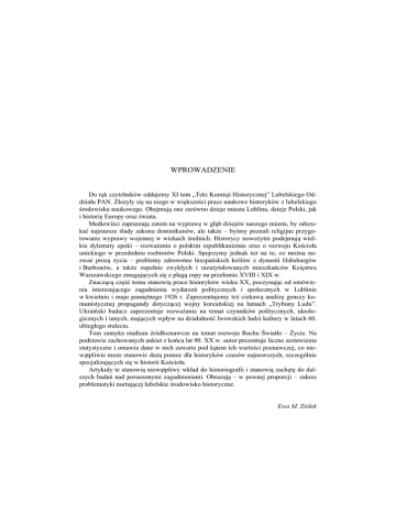 WPROWADZENIE Do rąk czytelników oddajemy XI tom „Teki Komisji Historycznej” Lubelskiego Oddziaáu PAN. ZáoĪyáy siĊ na niego w wiĊkszoĞci prace naukowe historyków z lubelskiego Ğrodowiska naukowego. Obejmują one zarówno dzieje miasta Lublina, dzieje Polski, jak i historiĊ Europy oraz Ğwiata. MediewiĞci zapraszają zatem na wyprawĊ w gáąb dziejów naszego miasta, by odszukaü najstarsze Ğlady zakonu dominikanów, ale takĪe – byĞmy poznali religijne przygotowanie wyprawy wojennej w wiekach Ğrednich. Historycy nowoĪytni podejmują wielkie dylematy epoki – rozwaĪania o polskim republikanizmie oraz o rozwoju KoĞcioáa unickiego w przededniu rozbiorów Polski. Spojrzymy jednak teĪ na to, co moĪna nazwaü prozą Īycia – problemy zdrowotne hiszpaĔskich królów z dynastii Habsburgów i Burbonów, a takĪe zupeánie zwykáych i nieutytuáowanych mieszkaĔców KsiĊstwa Warszawskiego zmagających siĊ z plagą ospy na przeáomie XVIII i XIX w. Znaczącą czĊĞü tomu stanowią prace historyków wieku XX, poczynając od omówienia interesującego zagadnienia wydarzeĔ politycznych i spoáecznych w Lublinie w kwietniu i maju pamiĊtnego 1926 r. Zaprezentujemy teĪ ciekawą analizĊ genezy komunistycznej propagandy dotyczącej wojny koreaĔskiej na áamach „Trybuny Ludu”. UkraiĔski badacz zaprezentuje rozwaĪania na temat czynników politycznych, ideologicznych i innych, mających wpáyw na dziaáalnoĞü lwowskich ludzi kultury w latach 60. ubiegáego stulecia. Tom zamyka studium Ĩródáoznawcze na temat rozwoju Ruchu ĝwiatáo – ĩycie. Na podstawie zachowanych ankiet z koĔca lat 90. XX w. autor prezentuje liczne zestawienia statystyczne i omawia dane w nich zawarte pod kątem ich wartoĞci poznawczej, co niewątpliwie moĪe stanowiü duĪą pomoc dla historyków czasów najnowszych, szczególnie specjalizujących siĊ w historii KoĞcioáa. Artykuáy te stanowią niewątpliwy wkáad do historiografii i stanowią zachĊtĊ do dalszych badaĔ nad poruszonymi zagadnieniami. Obrazują – w pewnej proporcji – zakres problematyki nurtującej lubelskie Ğrodowisko historyczne. Ewa M. Zióáek