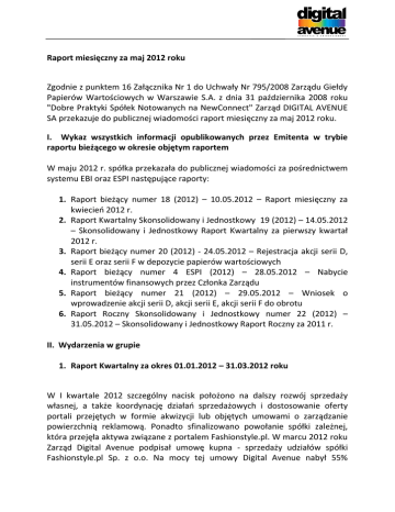 Raport miesięczny za maj 2012 roku Zgodnie z punktem 16 Załącznika Nr 1 do Uchwały Nr 795/2008 Zarządu Giełdy Papierów Wartościowych w Warszawie S.A. z dnia 31 października 2008 roku "Dobre Praktyki Spółek Notowanych na NewConnect" Zarząd DIGITAL AVENUE SA przekazuje do publicznej wiadomości raport miesięczny za maj 2012 roku. I. Wykaz wszystkich informacji opublikowanych przez Emitenta w trybie raportu bieżącego w okresie objętym raportem W maju 2012 r. spółka przekazała do publicznej wiadomości za pośrednictwem systemu EBI oraz ESPI następujące raporty: 1. Raport bieżący numer 18 (2012) – 10.05.2012 – Raport miesięczny za kwiecień 2012 r. 2. Raport Kwartalny Skonsolidowany i Jednostkowy 19 (2012) – 14.05.2012 – Skonsolidowany i Jednostkowy Raport Kwartalny za pierwszy kwartał 2012 r. 3. Raport bieżący numer 20 (2012) - 24.05.2012 – Rejestracja akcji serii D, serii E oraz serii F w depozycie papierów wartościowych 4. Raport bieżący numer 4 ESPI (2012) – 28.05.2012 – Nabycie instrumentów finansowych przez Członka Zarządu 5. Raport bieżący numer 21 (2012) – 29.05.2012 – Wniosek o wprowadzenie akcji serii D, akcji serii E, akcji serii F do obrotu 6. Raport Roczny Skonsolidowany i Jednostkowy numer 22 (2012) – 31.05.2012 – Skonsolidowany i Jednostkowy Raport Roczny za 2011 r. II. Wydarzenia w grupie 1. Raport Kwartalny za okres 01.01.2012 – 31.03.2012 roku W I kwartale 2012 szczególny nacisk położono na dalszy rozwój sprzedaży własnej, a także koordynację działań sprzedażowych i dostosowanie oferty portali przejętych w formie akwizycji lub objętych umowami o zarządzanie powierzchnią reklamową. Ponadto sfinalizowano powołanie spółki zależnej, która przejęła aktywa związane z portalem Fashionstyle.pl. W marcu 2012 roku Zarząd Digital Avenue podpisał umowę kupna - sprzedaży udziałów spółki Fashionstyle.pl Sp. z o.o. Na mocy tej umowy Digital Avenue nabył 55% udziałów w kapitale zakładowym spółki Fashionstyle.pl. Zawarcie w/w umowy stanowi realizację założeń biznesowych Digital Avenue, które zmierzają do pozyskania czołowej pozycji na rynku internetowych mediów lifestylowych i rozrywkowych. Fashionstyle Sp. z o.o. została zarejestrowana 20 kwietnia 2012 i będzie konsolidowana od 2 kwartału 2012. Pomimo niekorzystnych uwarunkowań makroekonomicznych, przychody Grupy Kapitałowej w I kwartale 2012 r. wzrosły rok do roku o 18%. Tak wysoka dynamika sprzedaży pomimo negatywnego otoczenia makroekonomicznego wynika głównie z włączenia do oferty portali zarządzanych przez Digital Avenue, jednak nie należących do Grupy Kapitałowej. Dynamika sprzedaży nie przełożyła się na zysk ze sprzedaży, ponieważ na portalach „zewnętrznych” pod zarządzaniem Digital Avenue realizuje znacznie niższe marże niż na portalach własnych. W rezultacie zysk ze sprzedaży i EBITDA spadły w porównaniu z 1 kwartałem 2011 o 42%, zysk operacyjny i brutto – o 81%, a zysk netto – o 83%. Silny spadek zysku operacyjnego, brutto i netto wynikał też, poza wymienionym już większym udziałem sprzedaży o niższej rentowności, także znacznie wyższym poziomem amortyzacji, niż przed rokiem (niemal 2-krotny wzrost amortyzacji rok do roku). Wysoka amortyzacja odzwierciedla intensywne prace rozwojowe nad udoskonaleniem portali należących do Grupy, przeprowadzone w 2011 roku. 2. Rejestracja akcji serii D, E oraz F w depozycie papierów wartościowych Zarząd Digital Avenue S.A. w dniu 24 maja 2012 r. powziął informację o uchwale nr 372/12 Krajowego Depozytu Papierów Wartościowych o warunkowej rejestracji: 1) 169.000 akcji serii D, 2) 912.227 akcji serii E, 3) 176.666 akcji serii F. Rejestracja akcji dokonana jest pod warunkiem wyznaczenia pierwszego dnia notowania akcji na rynku NewConnect. 3. Nabycie instrumentów finansowych przez Członka Zarządu Zarząd Digital Avenue S.A. w związku z rejestracją w dniu 23 maja 2012 r. w depozycie papierów wartościowych akcji serii D, akcji serii E oraz akcji serii F, otrzymał zawiadomienie od Prezesa Zarządu – Piotra Wąsowskiego – o nabyciu przez niego: W dniu 22.11.2011 r., w wyniku objęcia w dniu 18 sierpnia 2011 r. – 70 000 sztuk akcji serii D po cenie 0,10 zł za każdą akcję, W dniu 17.04.2012 r. w wyniku objęcia w dn. 28.03.2012 r. – 110 000 sztuk akcji serii F, po cenie 0,10 zł za każdą akcję. 4. Wniosek o wprowadzenie akcji serii D, akcji serii E oraz akcji serii F do obrotu W dniu 28 maja 2012 roku został złożony wniosek o wprowadzenie do obrotu w alternatywnym systemie obrotu NewConnect: 1) 169.000 (stu sześćdziesięciu dziewięciu tysięcy) akcji serii D, 2) 912.227 (dziewięciuset dwunastu tysięcy dwustu dwudziestusiedmiu) akcji serii E 3) 176.666 (stu siedemdziesięciu sześciu tysięcy sześciuset sześćdziesięciu sześciu) akcji serii F, tj. łącznie 1.257.893 (jednego miliona dwustu pięćdziesięciu siedmiu tysięcy ośmiuset dziewięćdziesięciu trzech) akcji zwykłych na okaziciela o wartości nominalnej 0,10 zł (dziesięć groszy) każda. 5. Prawie 900 tys. użytkowników Grupy Styl.fm Jak wynika z marcowego raportu Megapanel PBI/Gemius, Grupa Styl.fm posiada prawie 900 000 realnych użytkowników, którzy generują ponad 20 000 000 odsłon, co daje portalowi 4,55 % zasięgu w polskim Internecie. Źródło: raport Megapanel PBI/Gemius za marzec 2012, kategoria Styl Życia 6. Ponad 1,2 mln użytkowników Fotosik.pl W opublikowanym przez Megapanel PBI/Gemius raporcie za marzec 2012 Fotosik.pl zarządzany przez spółkę Medousa osiągnął w kategorii Kultura i Rozrywka następujące wyniki: ponad 1,2 mln realnych użytkowników, ponad 17 000 000 milionów odsłon, co daje ok. 6,34 % zasięg w polskim Internecie. Źródło: raport Megapanel PBI/Gemius za marzec 2012, kategoria Kultura i Rozrywka 7. Ponad 16 tysięcy fanów na Facebooku Styl.fm W maju 2012 liczba osób lubiących profil Styl.fm na 