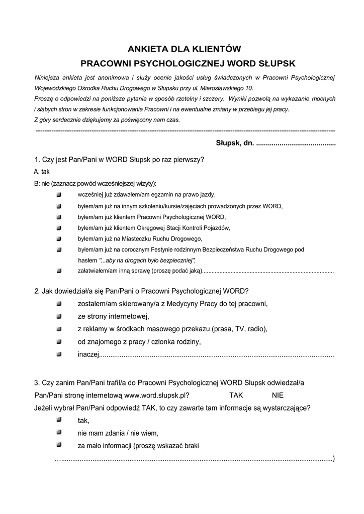 ANKIETA DLA KLIENTÓW PRACOWNI PSYCHOLOGICZNEJ WORD SŁUPSK Niniejsza ankieta jest anonimowa i służy ocenie jakości usług świadczonych w Pracowni Psychologicznej Wojewódzkiego Ośrodka Ruchu Drogowego w Słupsku przy ul. Mierosławskiego 10. Proszę o odpowiedzi na poniższe pytania w sposób rzetelny i szczery. Wyniki pozwolą na wykazanie mocnych i słabych stron w zakresie funkcjonowania Pracowni i na ewentualne zmiany w przebiegu jej pracy. Z góry serdecznie dziękujemy za poświęcony nam czas. -------------------------------------------------------------------------------------------------------------------------------------- Słupsk, dn. ......................................... 1. Czy jest Pan/Pani w WORD Słupsk po raz pierwszy? A. tak B: nie (zaznacz powód wcześniejszej wizyty): wcześniej już zdawałem/am egzamin na prawo jazdy, byłem/am już na innym szkoleniu/kursie/zajęciach prowadzonych przez WORD, byłem/am już klientem Pracowni Psychologicznej WORD, byłem/am już klientem Okręgowej Stacji Kontroli Pojazdów, byłem/am już na Miasteczku Ruchu Drogowego, byłem/am już na corocznym Festynie rodzinnym Bezpieczeństwa Ruchu Drogowego pod hasłem "...aby na drogach było bezpieczniej", załatwiałem/am inną sprawę (proszę podać jaką)................................................................................... 2. Jak dowiedział/a się Pan/Pani o Pracowni Psychologicznej WORD? zostałem/am skierowany/a z Medycyny Pracy do tej pracowni, ze strony internetowej, z reklamy w środkach masowego przekazu (prasa, TV, radio), od znajomego z pracy / członka rodziny, inaczej............................................................................................................................. 3. Czy zanim Pan/Pani trafił/a do Pracowni Psychologicznej WORD Słupsk odwiedzał/a Pan/Pani stronę internetową www.word.słupsk.pl? TAK NIE Jeżeli wybrał Pan/Pani odpowiedź TAK, to czy zawarte tam informacje są wystarczające? tak, nie mam zdania / nie wiem, za mało informacji (proszę wskazać braki …...................................................................................................................................................) 4. Proszę dokonać oceny (ocena w skali od 1 do 5 - ocena 1 najniższa, 5 - najwyższa): wygląd i wyposażenie Pracowni Psychologicznej: 1 – 2 – 3 – 4 – 5 kompetencje i fachowa wiedza psychologa: 1 – 2 – 3 – 4 – 5 sposób prowadzenia badania: 1 – 2 – 3 – 4 – 5 życzliwość i uprzejmość psychologa: 1 – 2 – 3 – 4 – 5 sprawna i szybka obsługa organizacyjna: 1 – 2 – 3 – 4 – 5 5. Proszę dokonać oceny przebiegu badania (ocena w skali od 1 do 5): przedstawienie charakterystyki prowadzonych badań i ich znaczenia: 1 – 2 – 3 – 4 – 5 jasne/przejrzyste wyjaśnienie sposobu rozwiązywania testów: 1 – 2 – 3 – 4 – 5 przekazywanie informacji o wynikach badań: 1 – 2 – 3 – 4 – 5 6. Czy ma Pan/Pani zastrzeżenia do sposobu przeprowadzania badania/konsultacji psychologicznej przez psychologa? TAK NIE (proszę wskazać jakie .................................................................................................................................................) 7. Dane na temat osoby wypełniającej ankietę: Płeć: Wiek w latach: Miejsce zamieszkania kobieta do 30 miasto mężczyzna 30 - 50 wieś powyżej 50 8. Inne uwagi dotyczące funkcjonowania, organizacji Pracowni Psychologicznej WORD: …........................................................................................................................................................ …........................................................................................................................................................